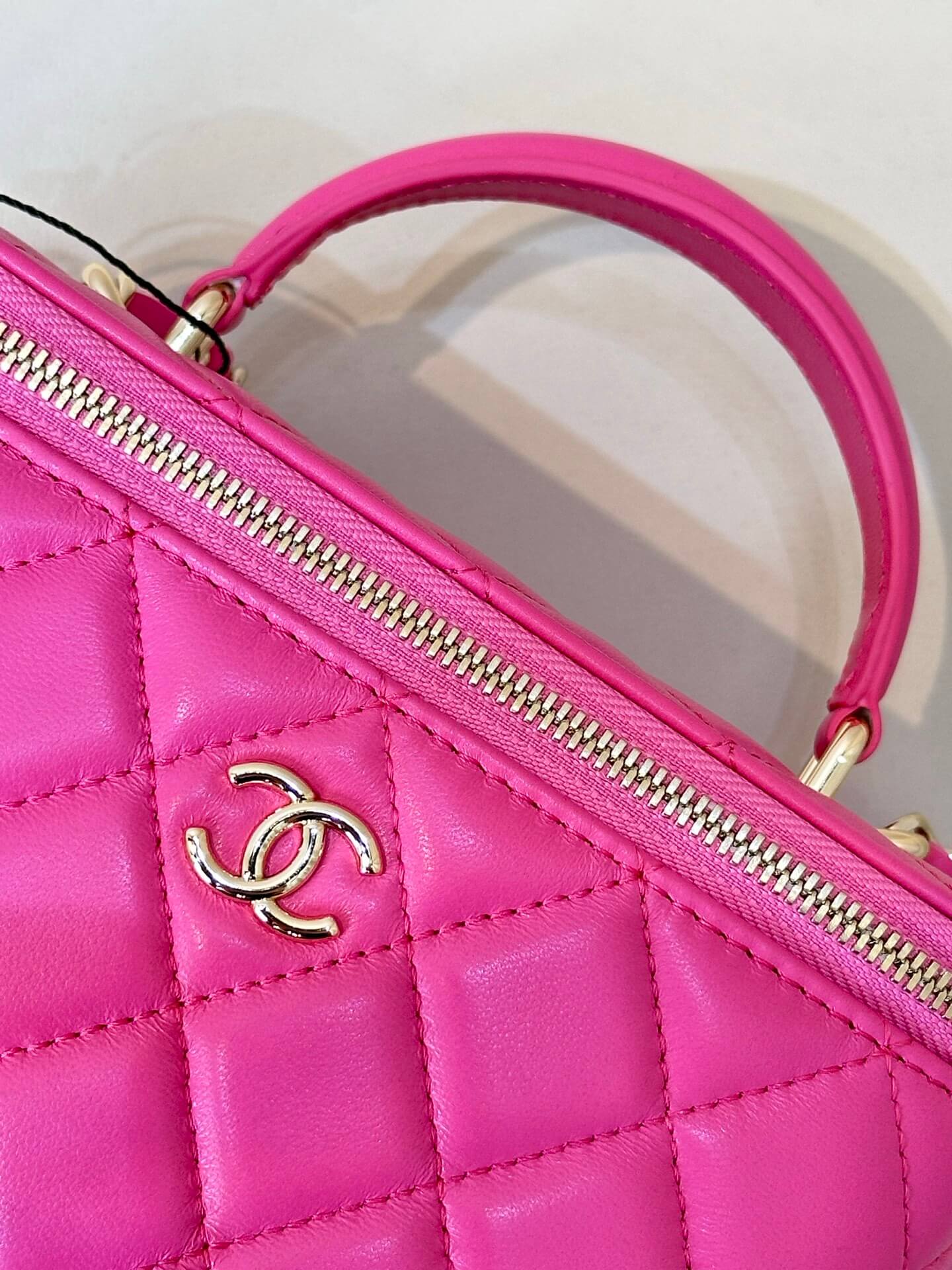 Description / الوصفA refined lambskin box bag with a champagne gold logo handle, available in two practical sizes.حقيبة بوكس راقية من جلد الغنم بمقبض شعار ذهبي، متوفرة بمقاسين عمليين.