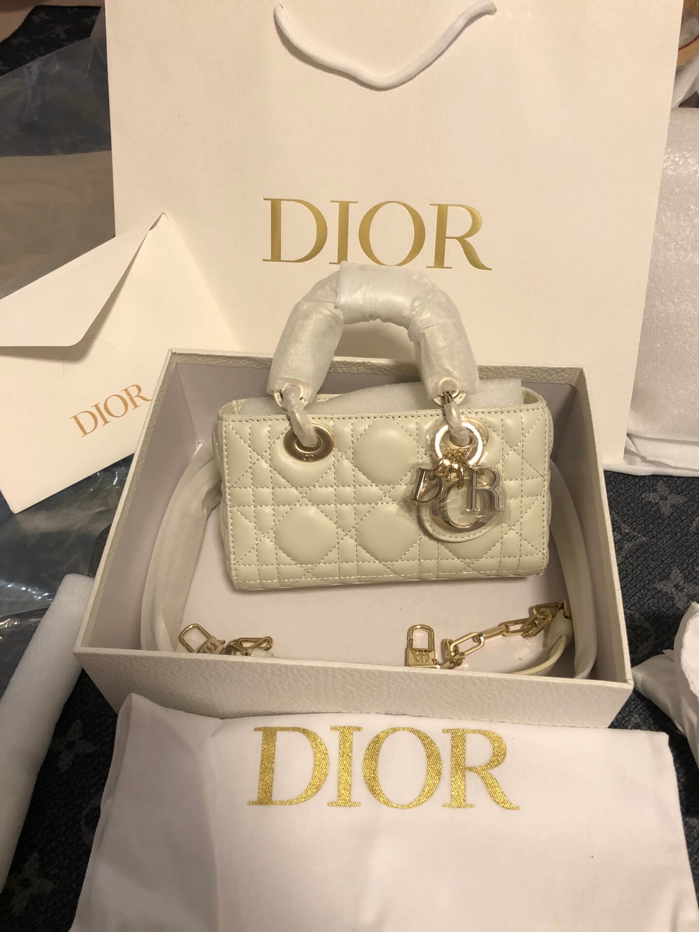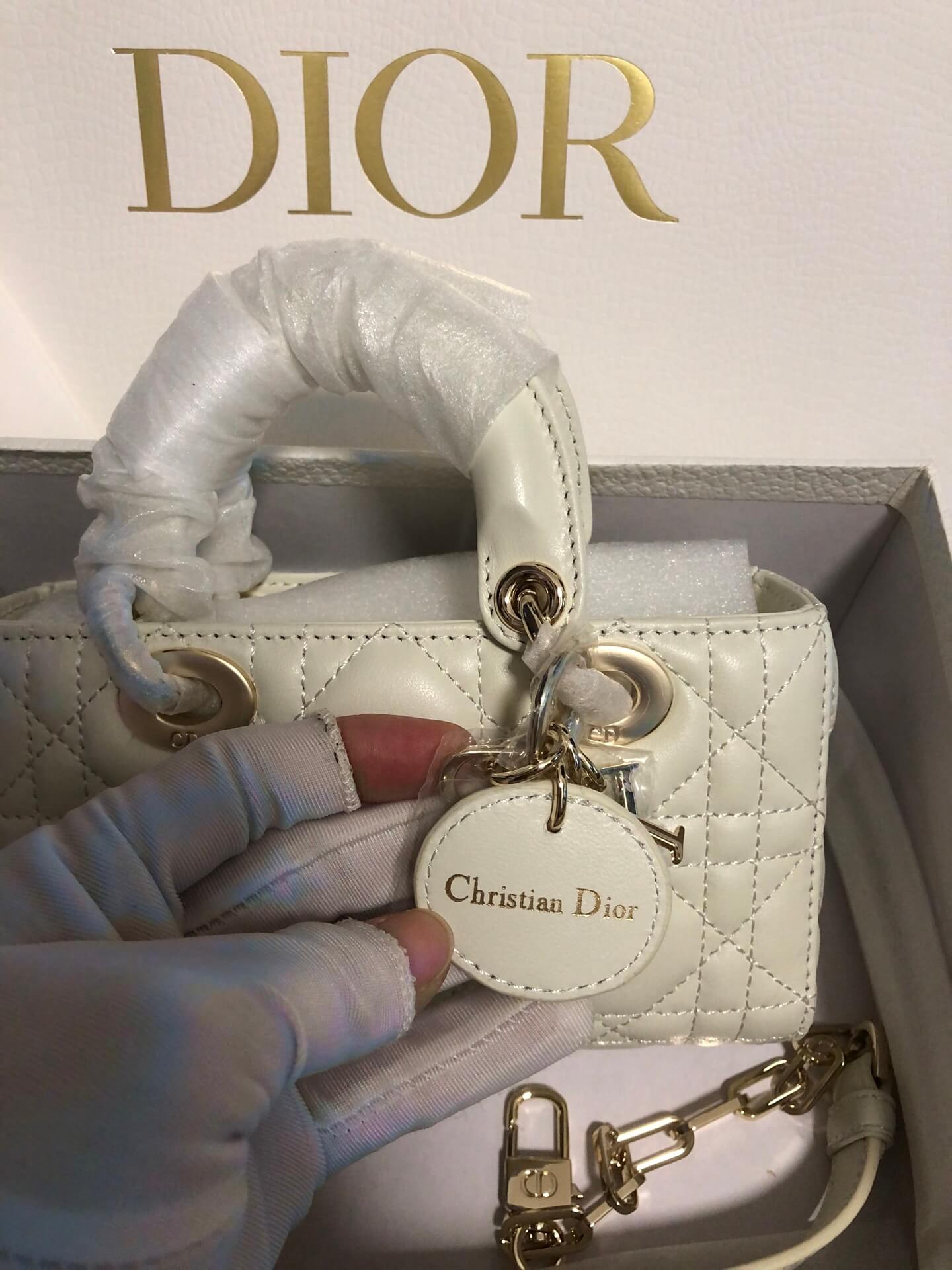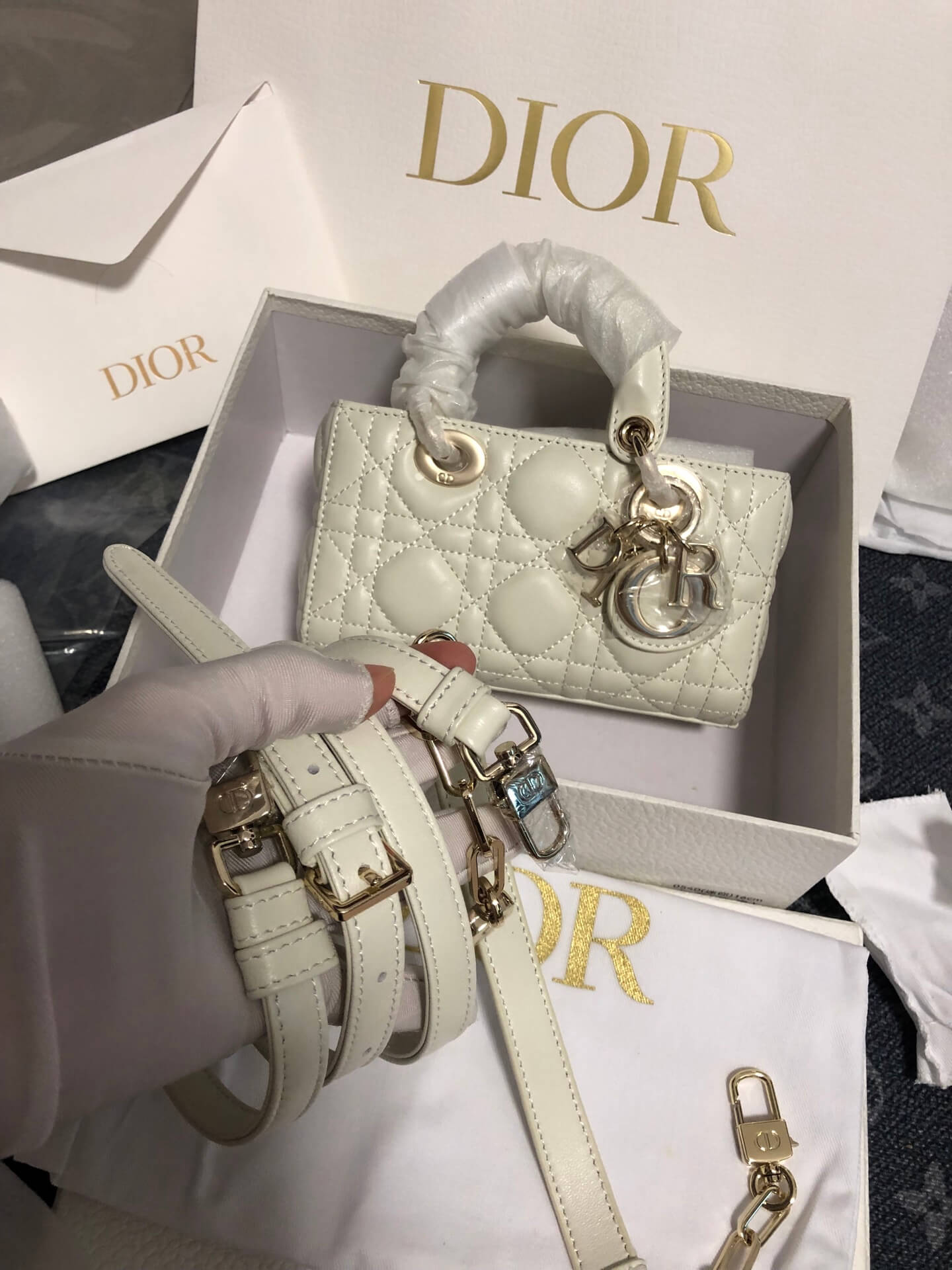 Description / الوصفA timeless mini bag in ivory lambskin featuring iconic Cannage quilting and signature charms.حقيبة ميني خالدة من جلد الحمل العاجي تتميز بتطريز “كاناج” الأيقوني وحليات الماركة.