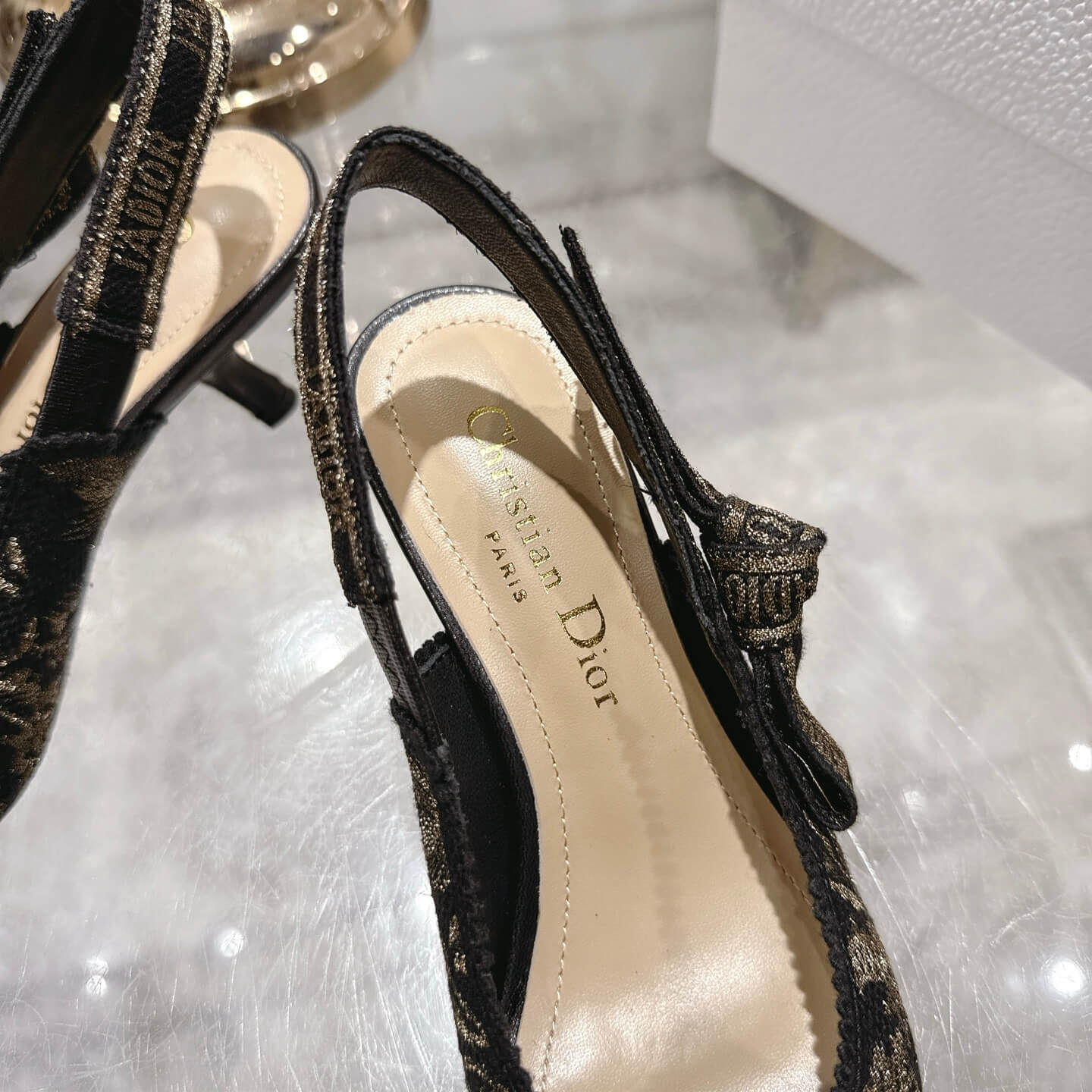 Features: Signature two-tone “J’Adior” embroidered cotton ribbon, flat bow, comma heel, and leather sole with the signature star. شريط قطني مطرز بلونين “ج’ادور” المميز، عقدة مسطحة، كعب “فاصلة”، ونعل جلدي يحمل النجمة المميزة.