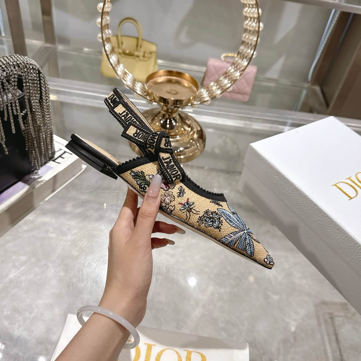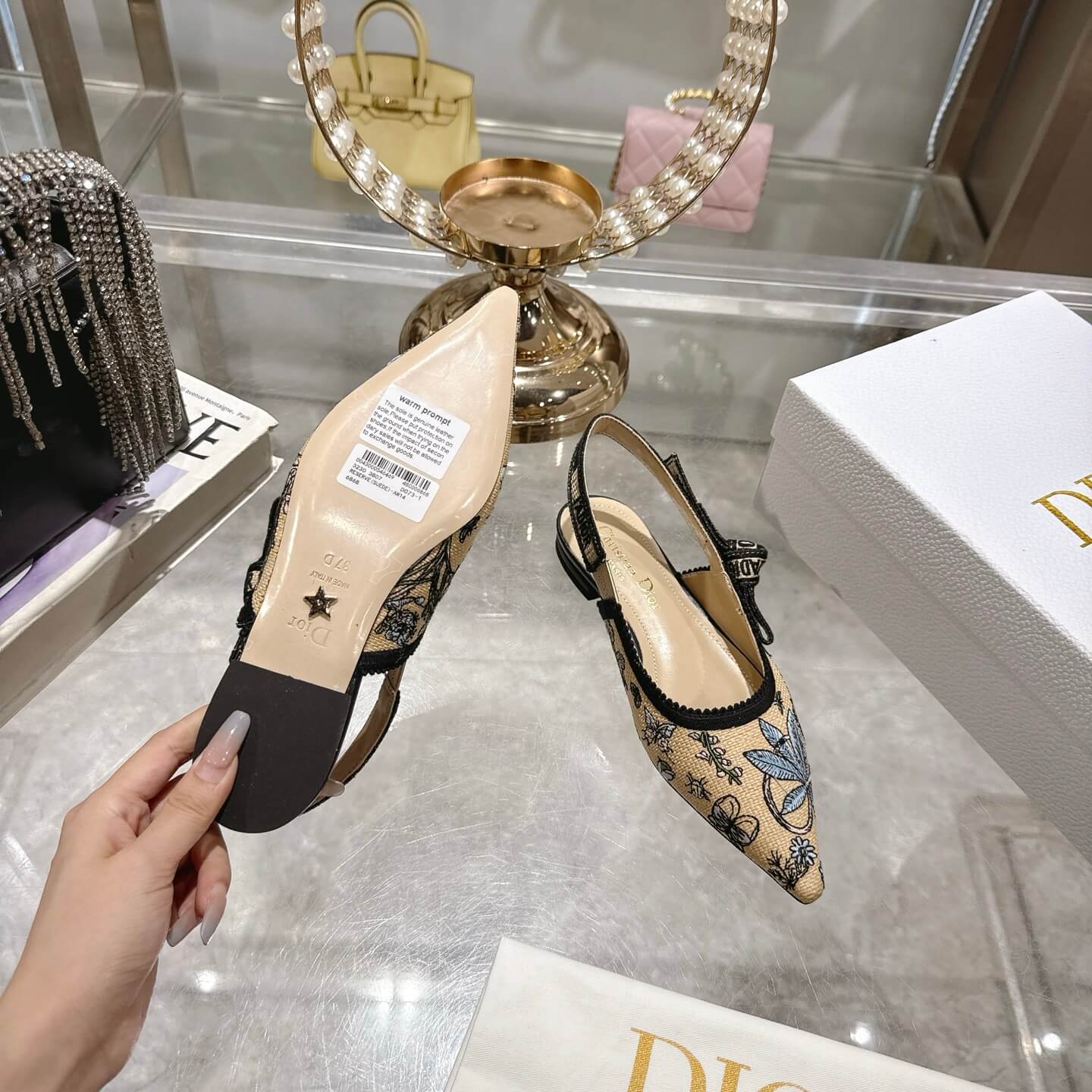 Features: Signature two-tone “J’Adior” embroidered cotton ribbon, flat bow, comma heel, and leather sole with the signature star. شريط قطني مطرز بلونين “ج’ادور” المميز، عقدة مسطحة، كعب “فاصلة”، ونعل جلدي يحمل النجمة المميزة.