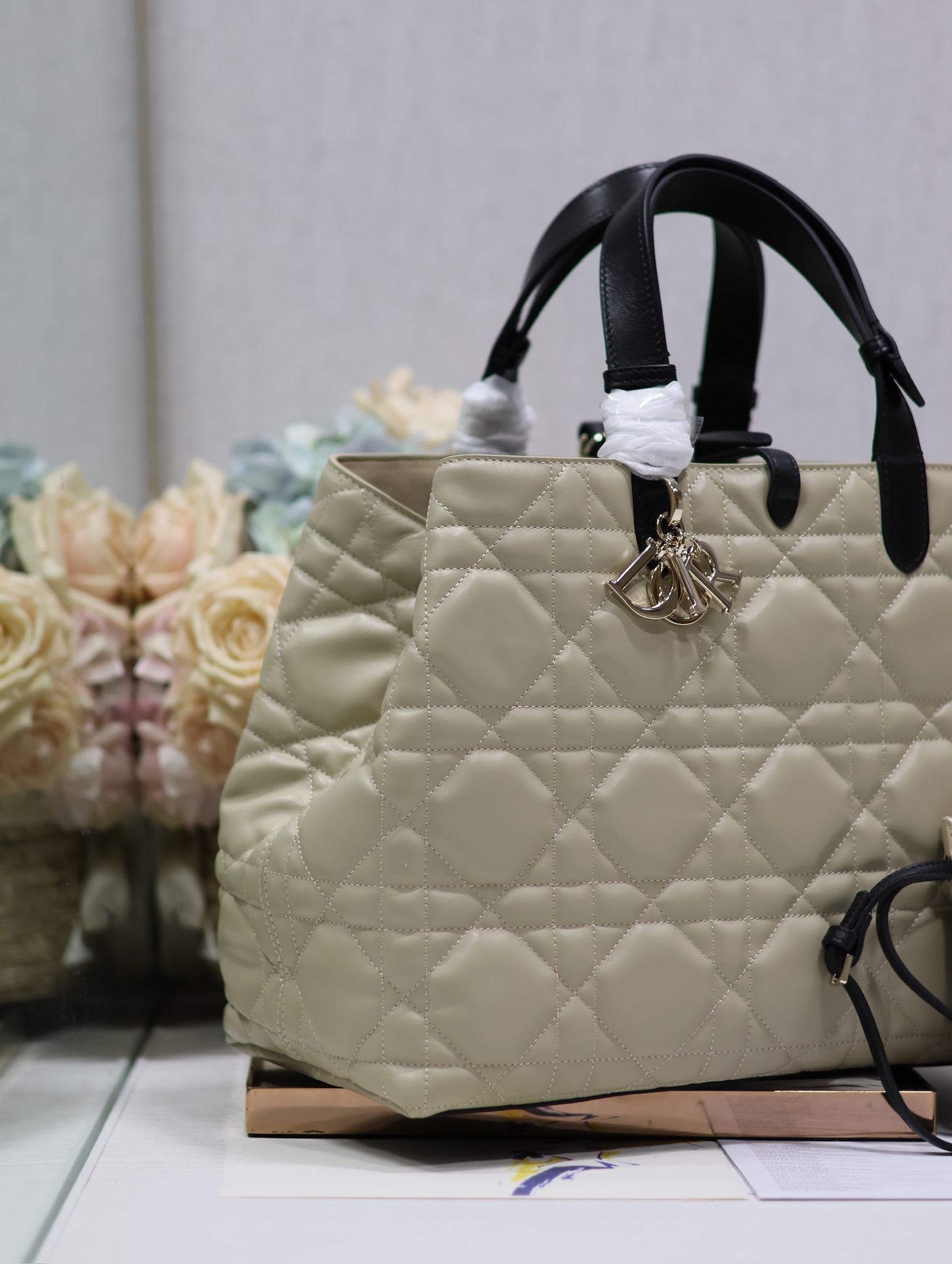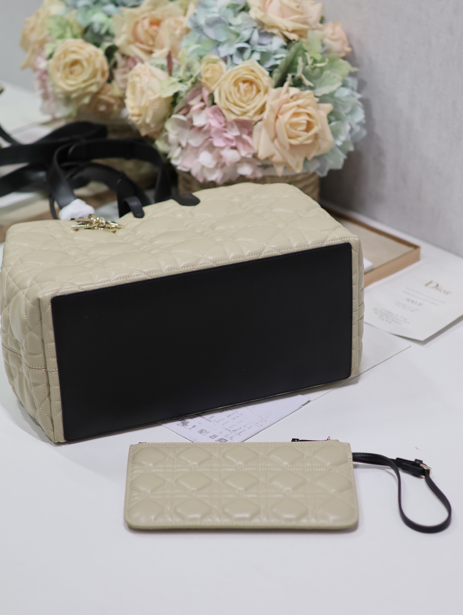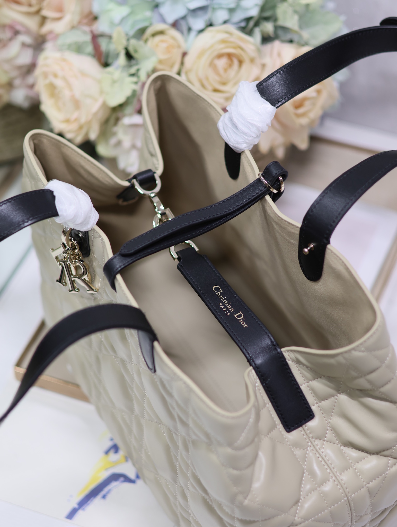 Features / المميزاتRemovable pouch, DIOR charm, adjustable handles, drawstringمحفظة قابلة للفصل، تعليقة DIOR، مقابض قابلة للتعديل، رباط سحب
