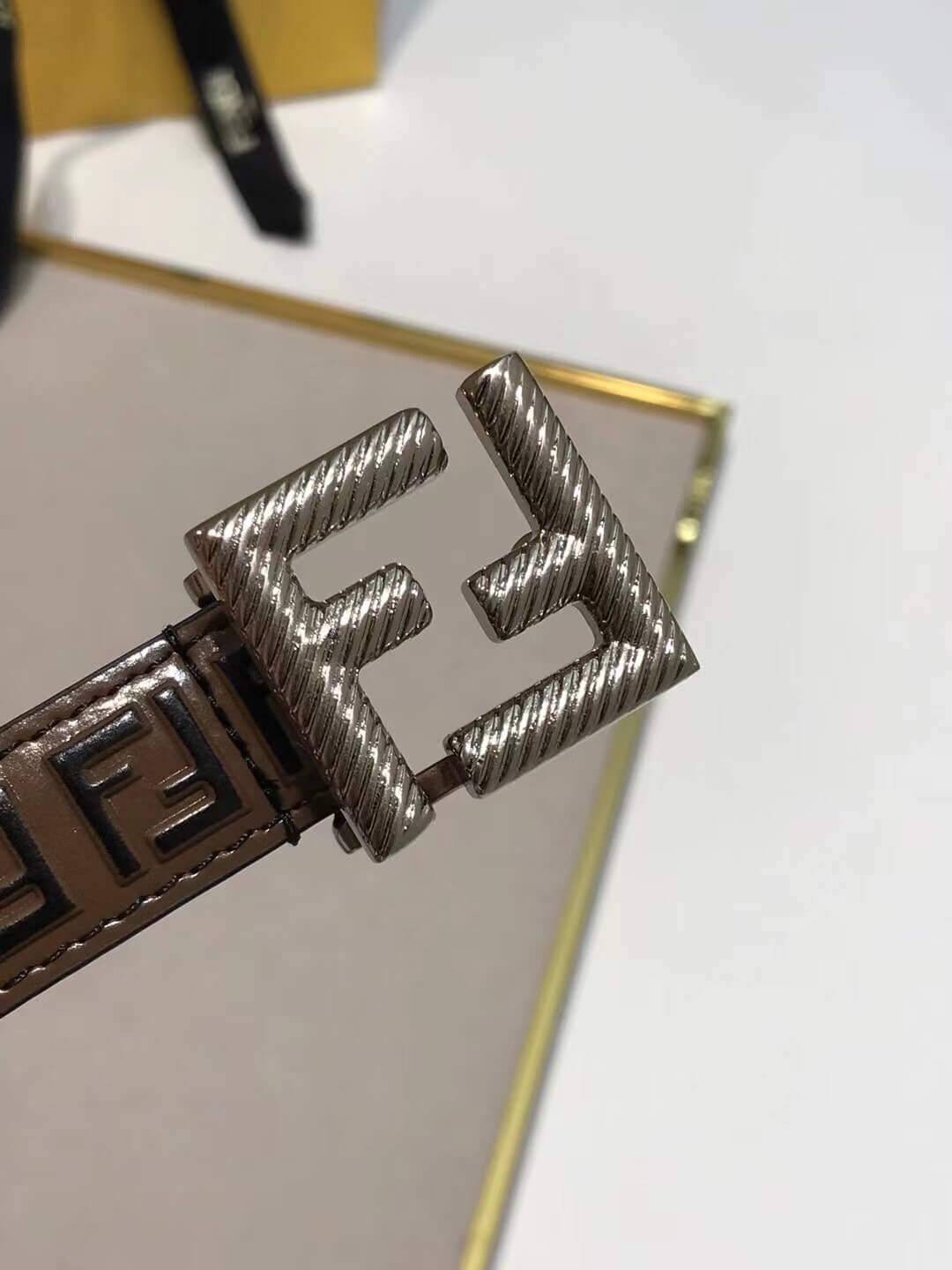 Description A high-quality, narrow leather belt featuring an embossed, hand-painted FF pattern and gold-plated hardware, offering a textured finish superior to standard prints. الوصف: حزام جلدي ضيق وعالي الجودة يتميز بنمط FF منقوش ومرسوم يدويًا وأدوات معدنية مطلية بالذهب، مما يوفر لمسة نهائية ذات جودة عالية.