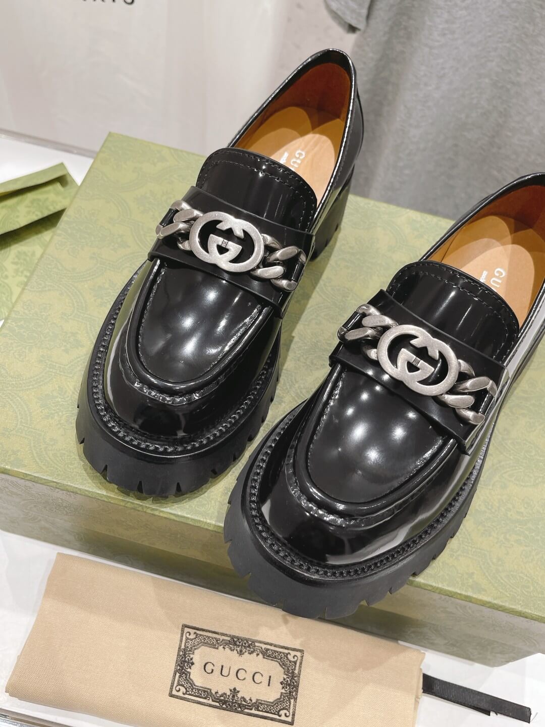 Description A sophisticated and versatile patent leather loafer with a bold lug sole and striking metallic G-chain detail, perfect for both casual and elevated looks. الوصف حذاء لوفر جلدي أنيق ومتعدد الاستخدامات بنعل سميك وجذاب، وتفاصيل سلسلة معدنية بارزة بشعار G، مناسب للإطلالات الكاجوال والرسمية.