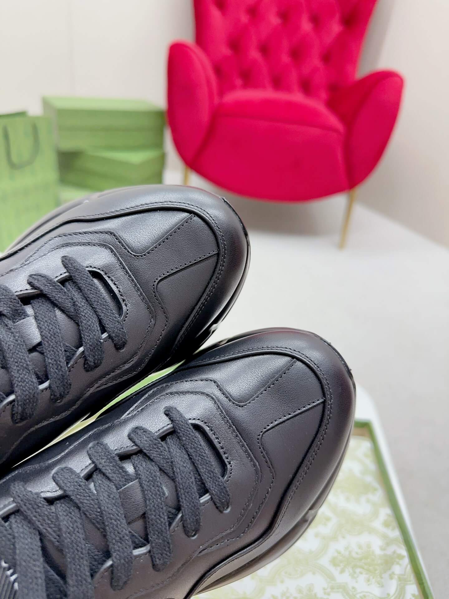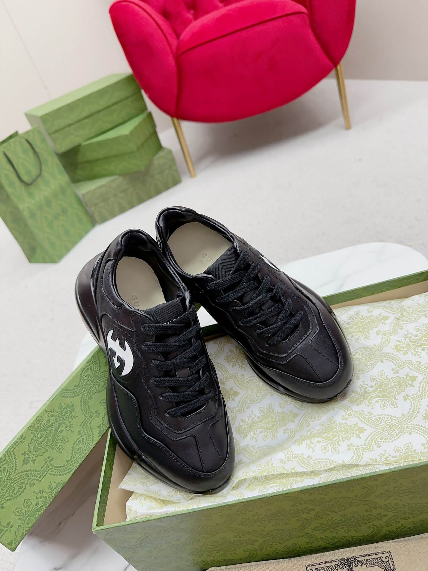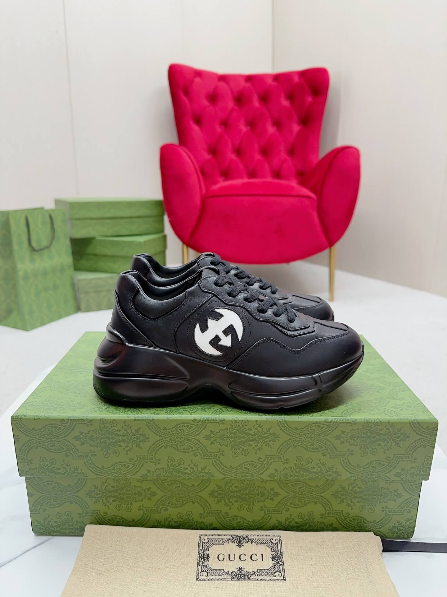 Craftsmanship: Made in Italy; features a bulky construction, a contrasting Interlocking G cut-out logo on the side, and a logo flag on the tongue. صنع في إيطاليا؛ يتميز ببنية ضخمة، وشعار G متشابك مقطوع بلون مغاير على الجانب، وعلامة شعار على اللسان.