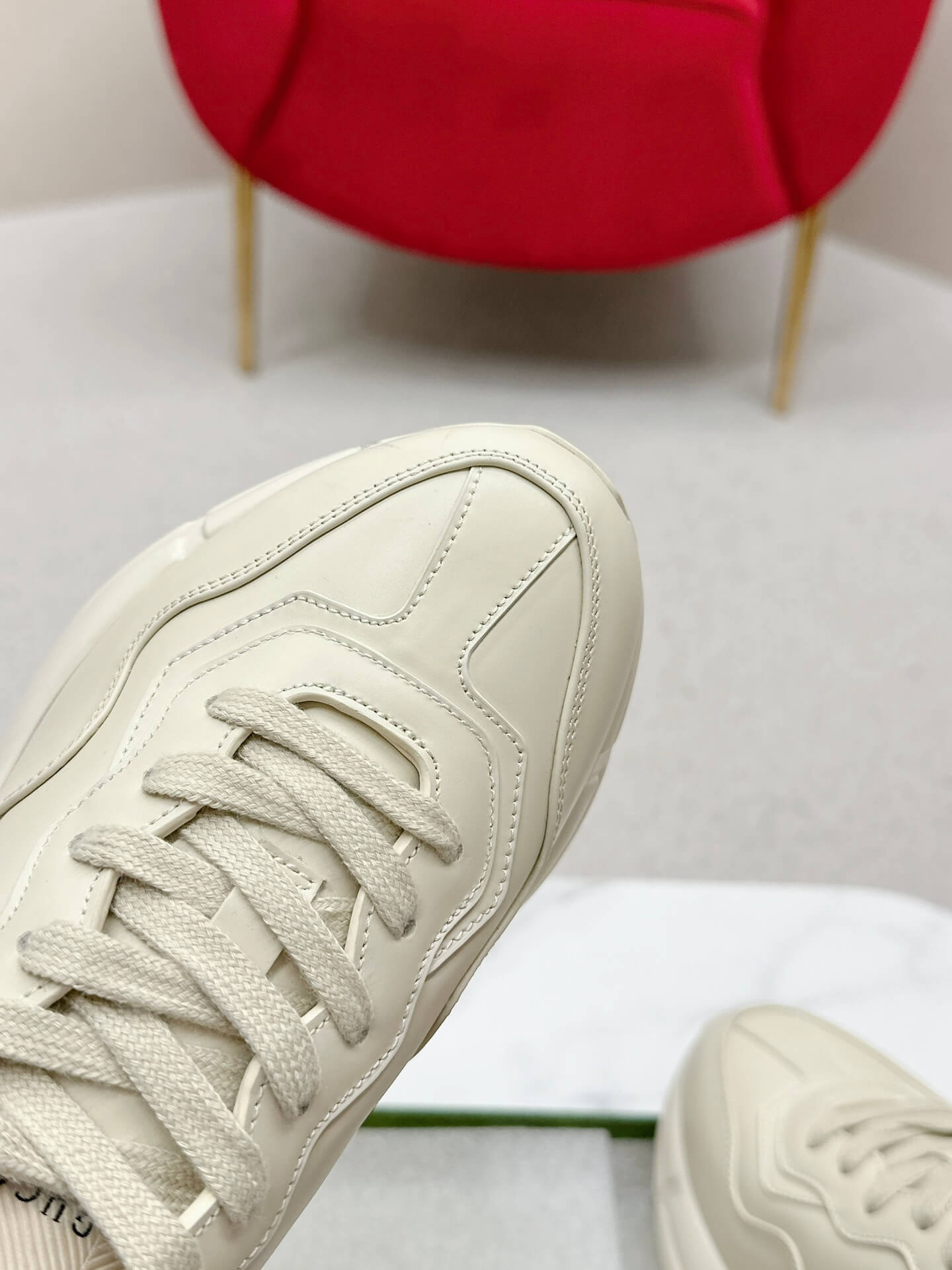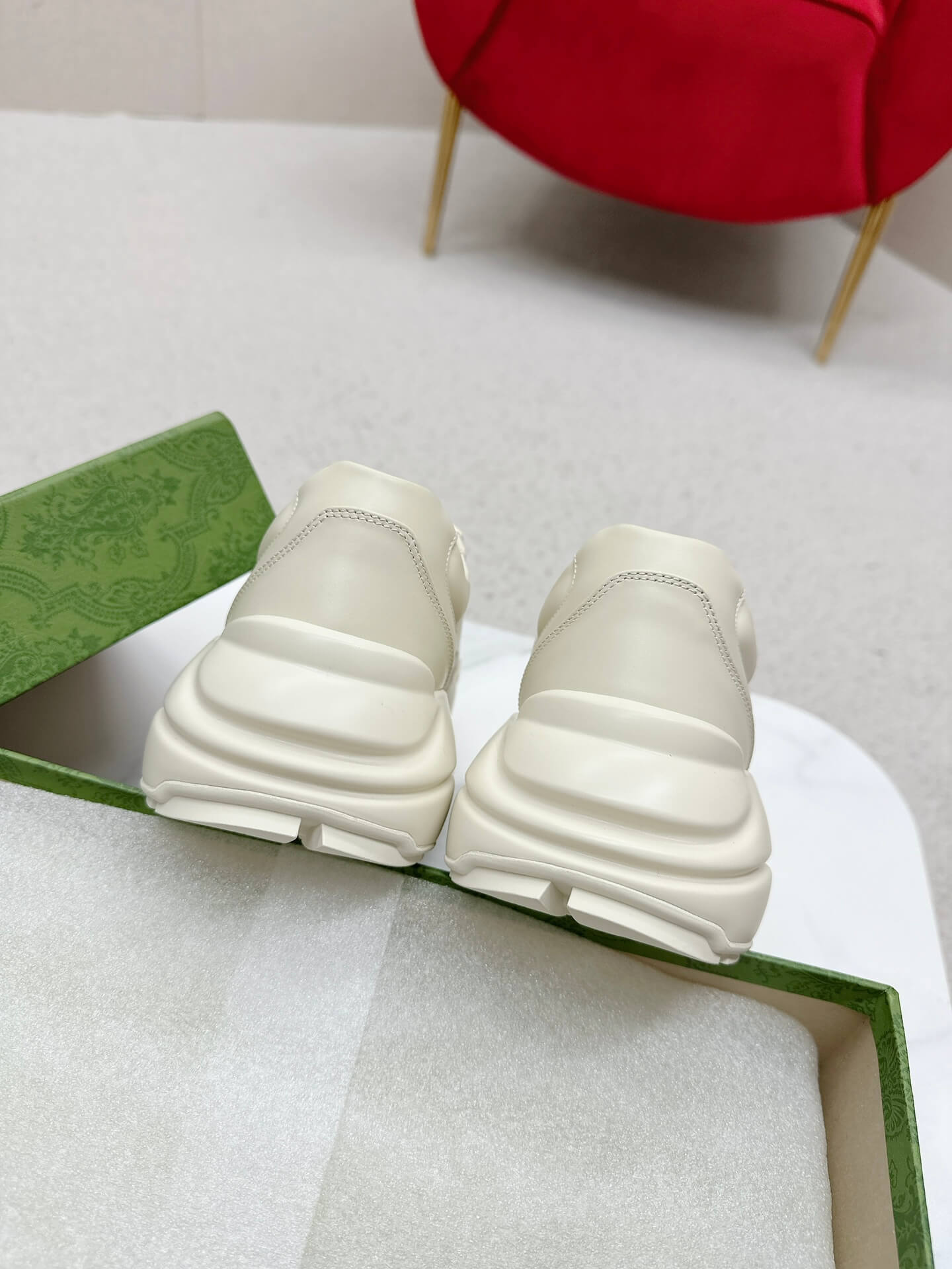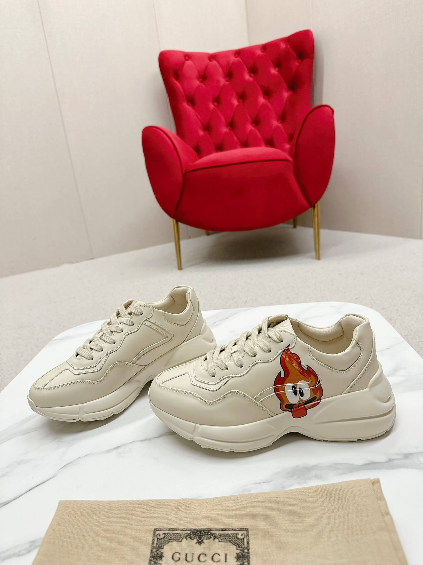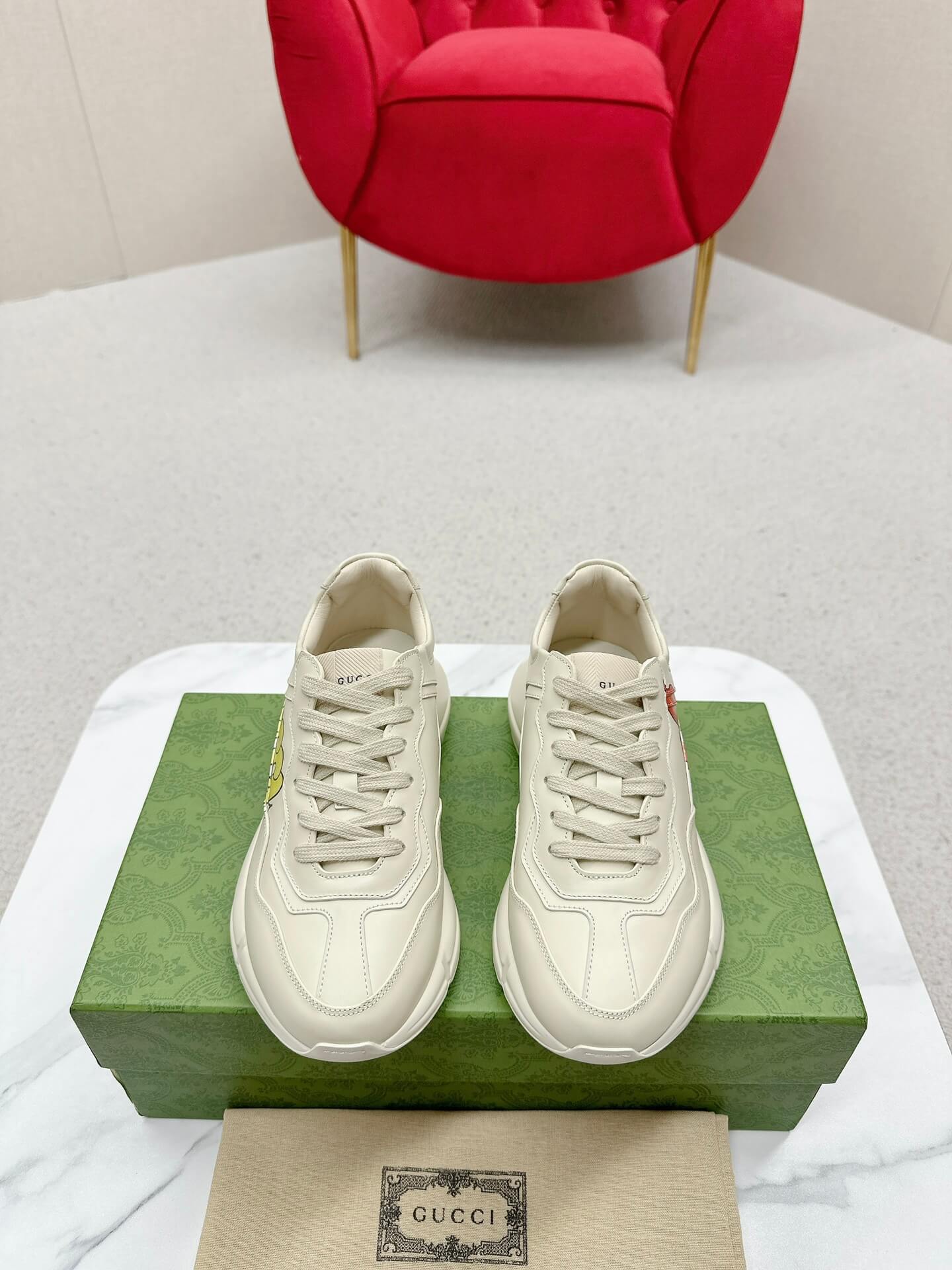 Short Description A stylish, chunky leather sneaker that combines Gucci’s luxury branding with unique graphic art for a statement casual look. وصف قصير: حذاء رياضي جلدي أنيق وضخم يمزج بين علامة غوتشي الفاخرة والفن الجرافيكي الفريد لإطلالة كاجوال مميزة.