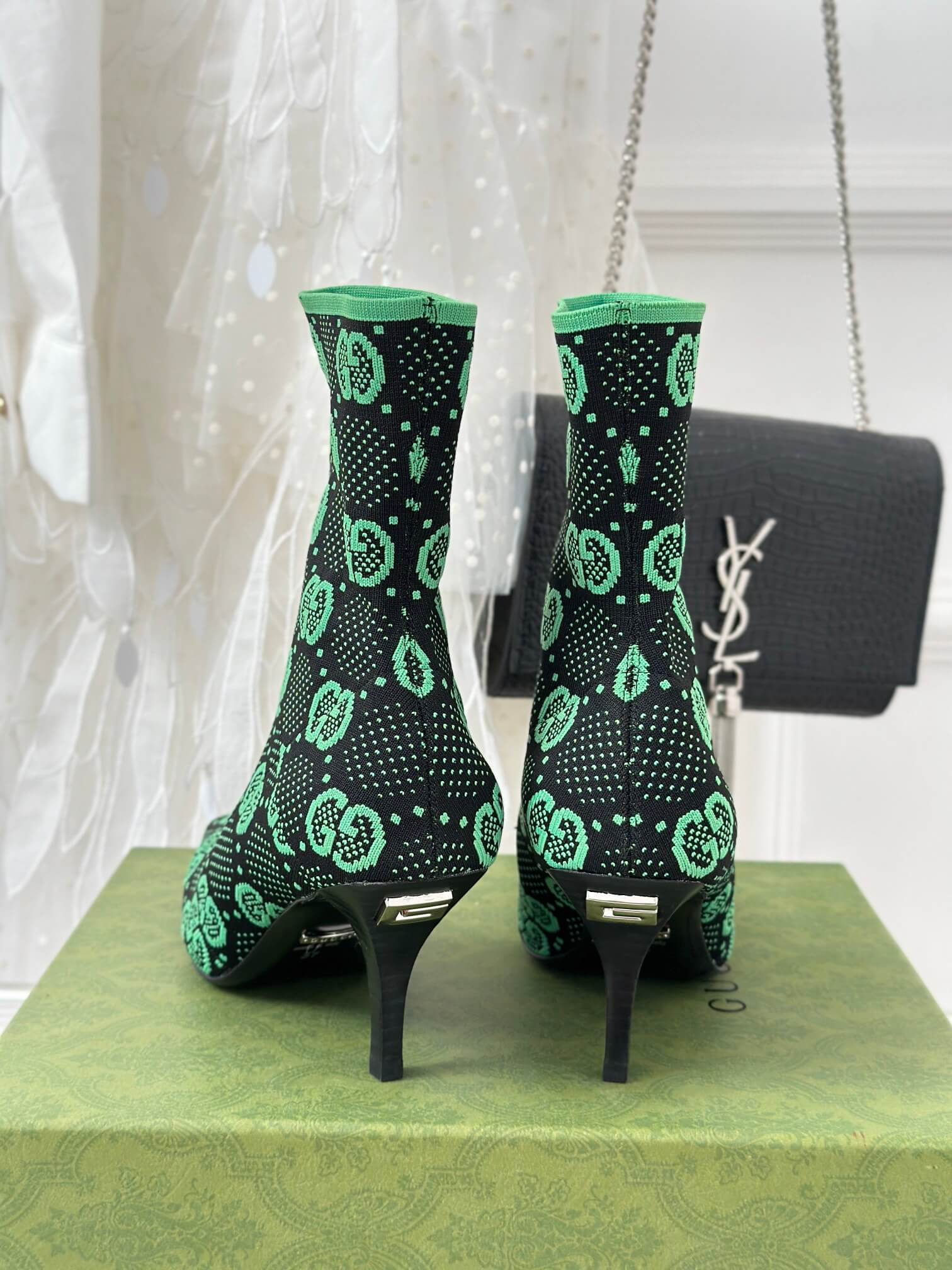 Craftsmanship Made in Italy; features a stiletto heel, stretch upper, and G metal detail for brand appreciation صنع في إيطاليا؛ يتميز بكعب رفيع، وجزء علوي قابل للتمدد، وتفصيل معدني على شكل G لتقدير العلامة التجارية