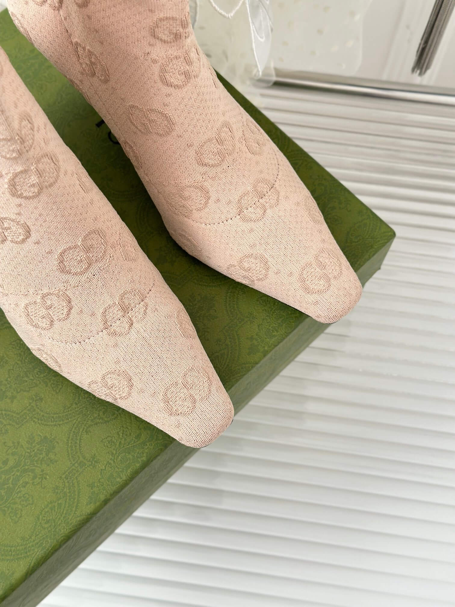Material Custom GG knit fabric upper with amazing elasticity, mixed sheepskin foot pads, and Italian imported cowhide outsole الجزء العلوي من نسيج GG المخصص بمرونة مذهلة، وبطانة قدم من جلد الغنم المخلوط، ونعل خارجي من جلد البقر المستورد من إيطاليا