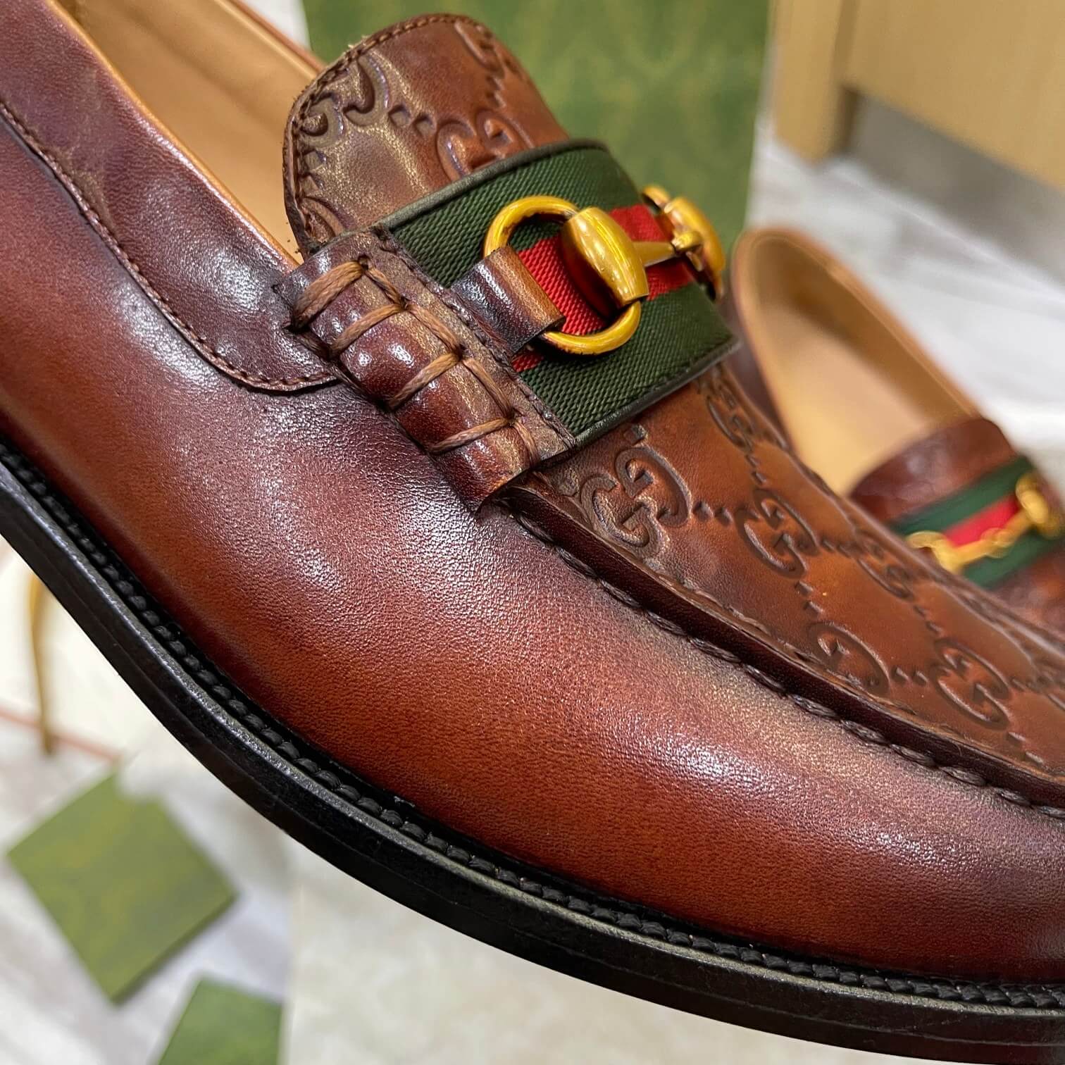 Material Top-grain Italian genuine leather upper (embossed GG pattern), imported water-dyed cowhide lining, genuine imported leather outsole جزء علوي من جلد البقر الإيطالي الأصلي عالي الجودة (نقش GG بارز)، بطانة من جلد البقر المستورد المصبوغ بالماء، نعل خارجي من الجلد الطبيعي المستورد