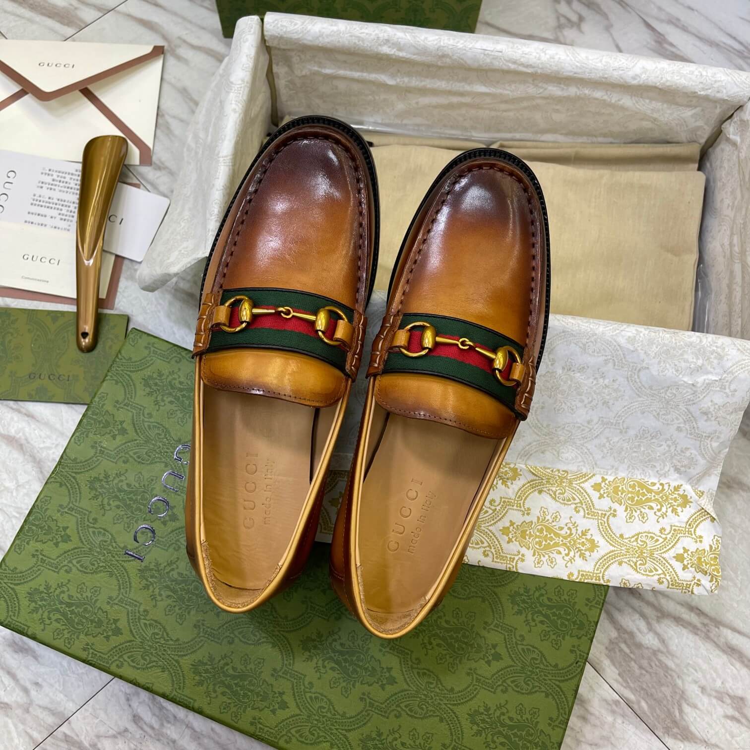 Features Gold-toned Horsebit hardware, signature red and green Web detail, superb sense of occasion تفصيل معدني ذهبي لشعار “الحصان”، وشريط “ويب” الأحمر والأخضر المميز، إحساس رائع بالمناسبة