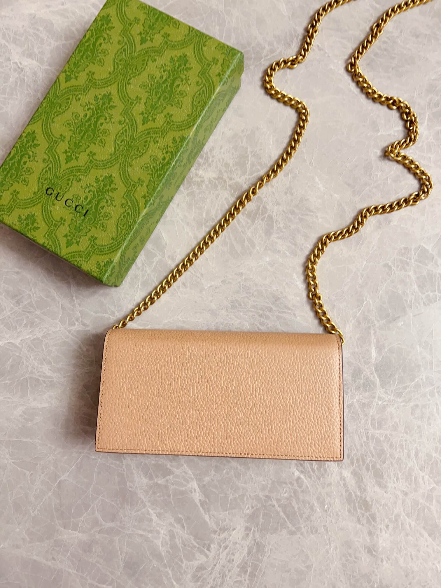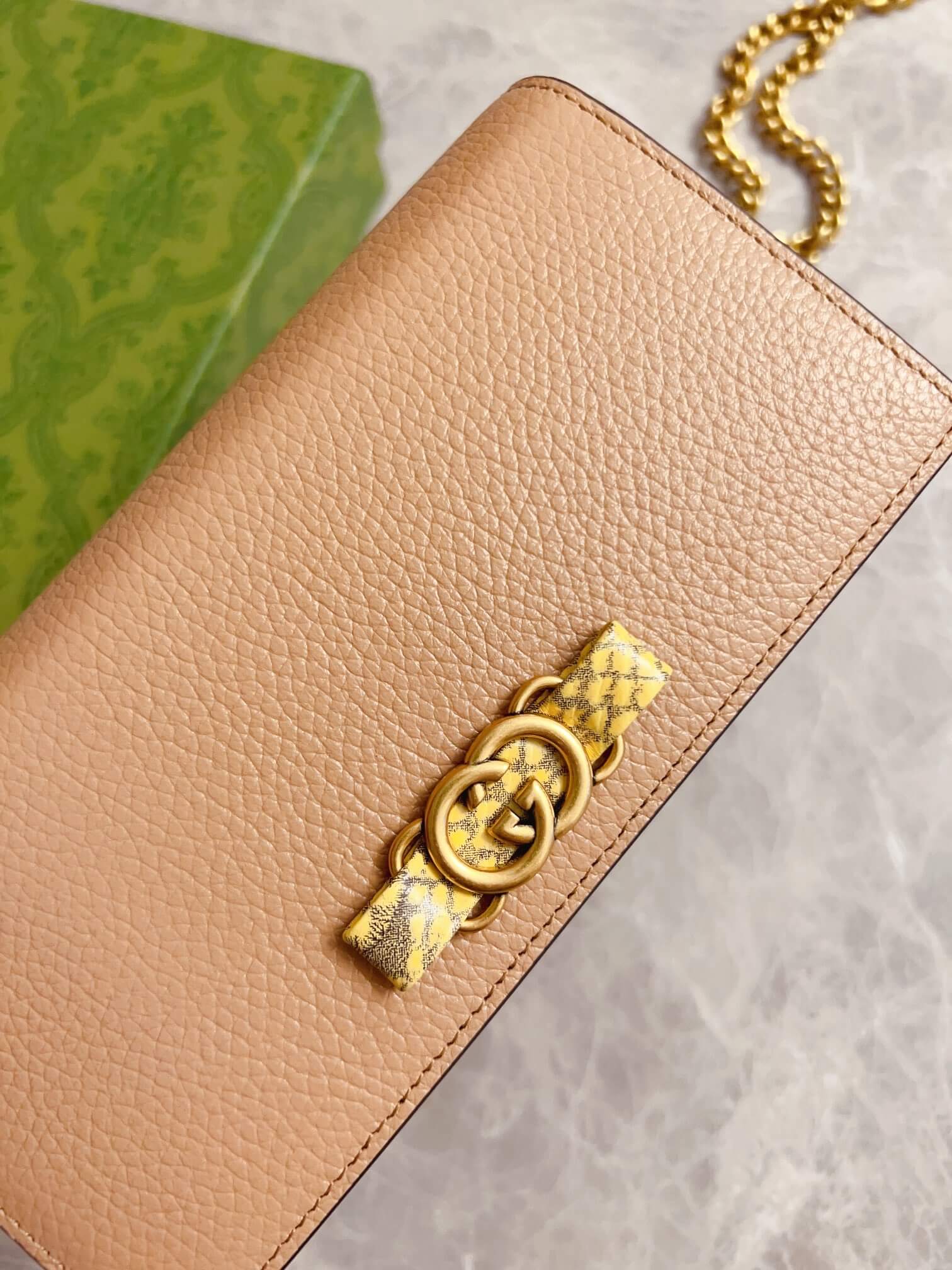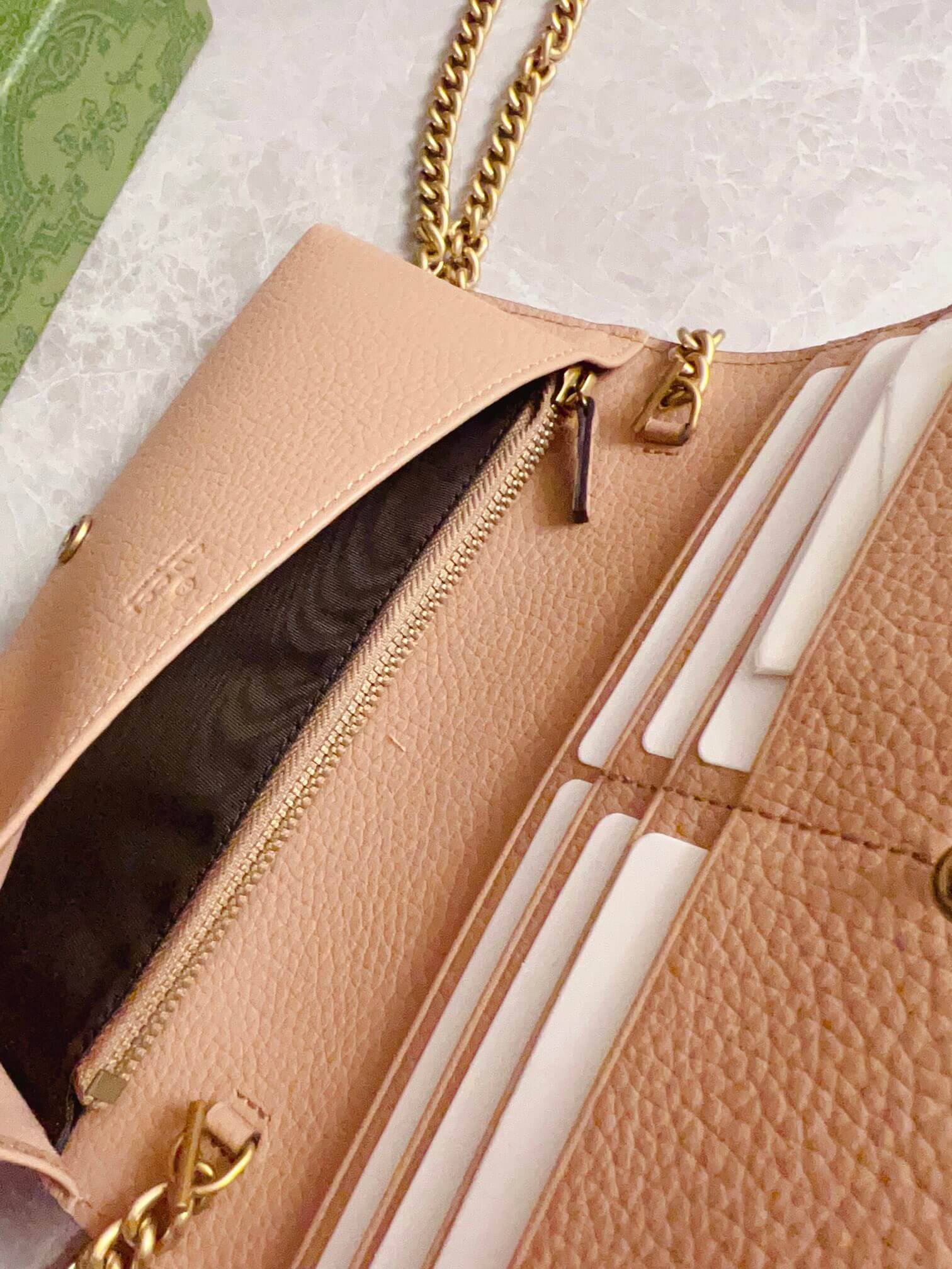 Features Interlocking G logo detail on the bow, snap button closure, chain strap (approx. 23.6″ drop), interior card slots and zip pocket شعار G المتداخل على القوس، إغلاق بزر كبس، حزام سلسلة، وفتحات بطاقات وجيب بسحاب بالداخل