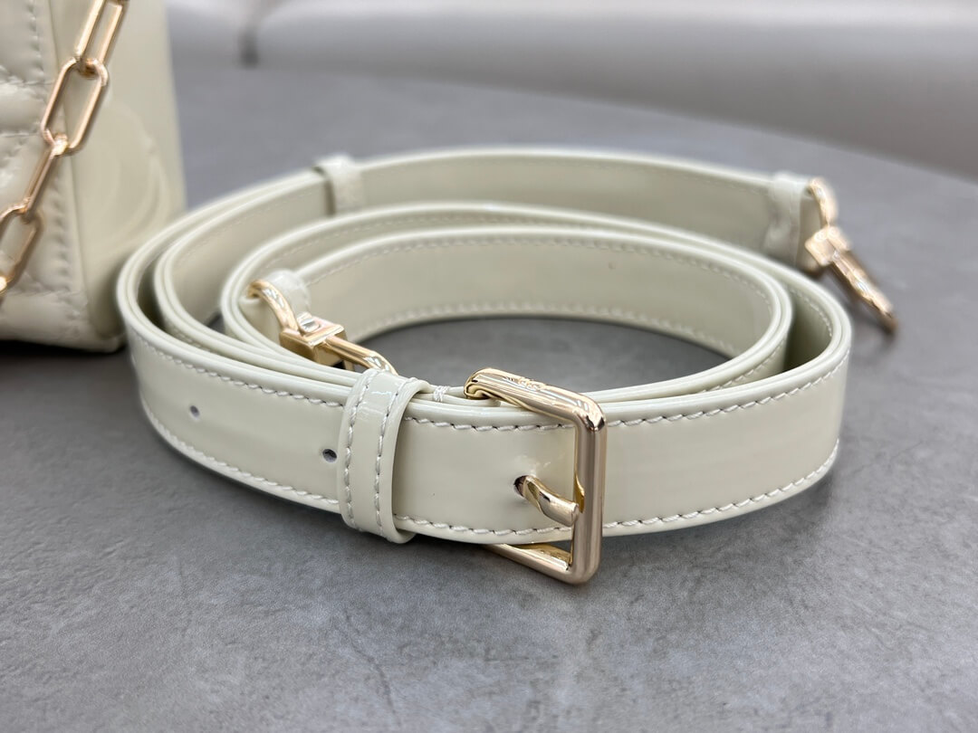 Features Light gold-tone D.I.O.R charm, detachable chain strap, adjustable leather strap, and internal storage دلاية D.I.O.R بلمسة ذهبية فاتحة، حزام سلسلة قابل للفصل، حزام جلدي قابل للتعديل، ومساحة تخزين داخلية