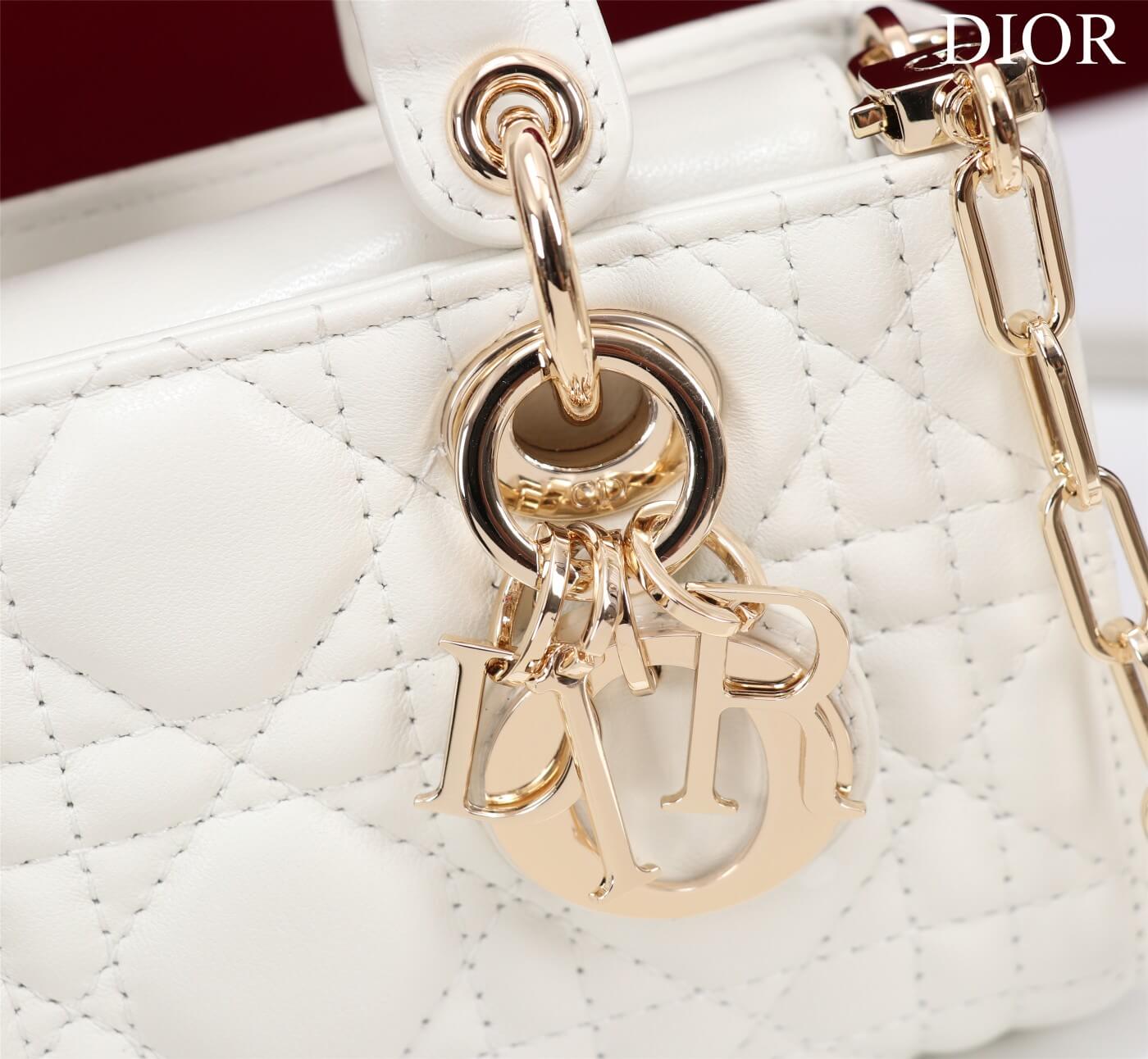Features Two detachable straps (chain and leather), D.I.O.R. charms, lambskin lining حزامين قابلين للفصل (سلسلة وجلدي)، شعارات D.I.O.R.، وبطانة من جلد الحمل