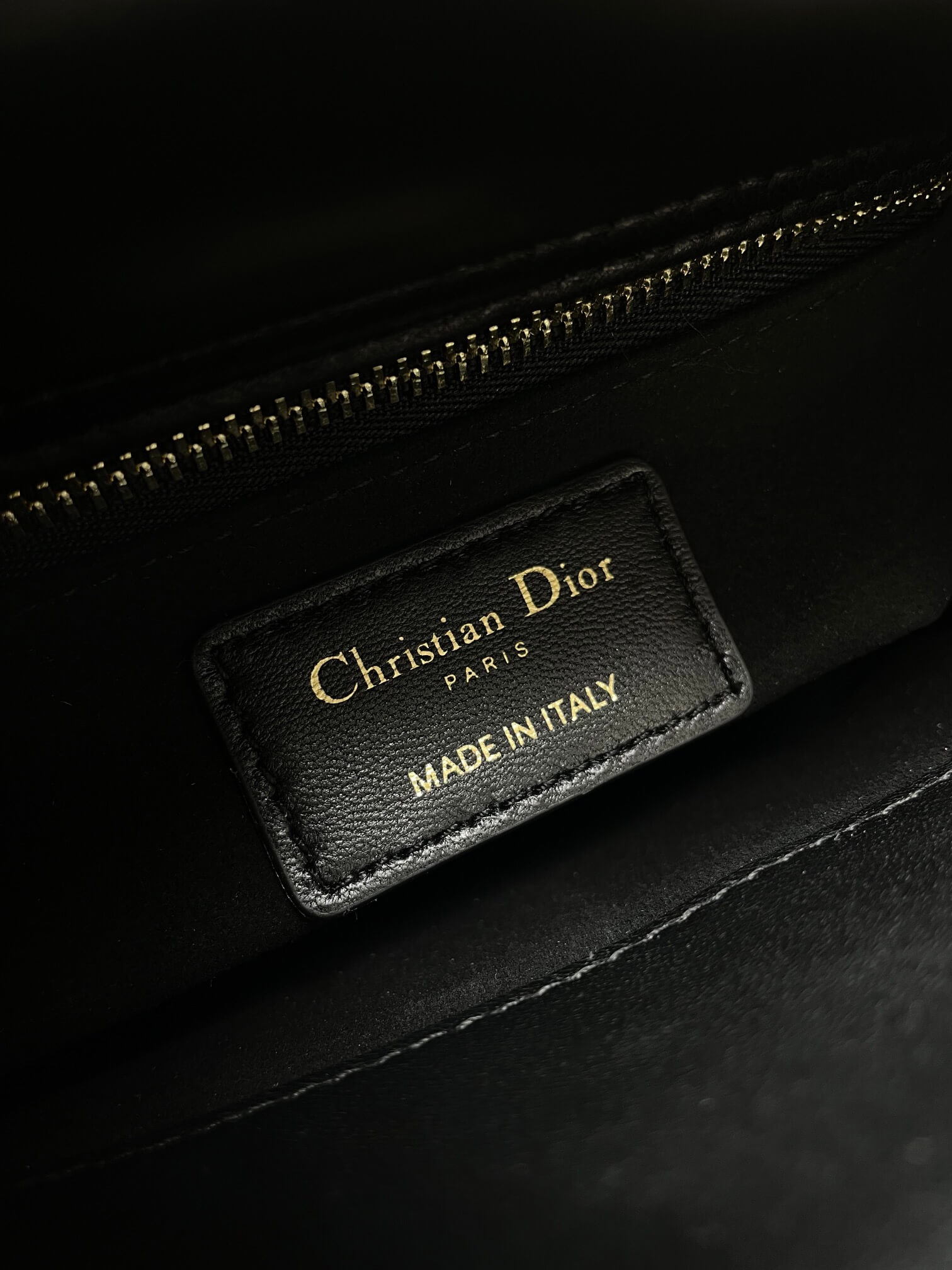 Features Decorative gold-tone enamel DIOR letters, Detachable shoulder strap, Three internal compartments حروف DIOR من المينا الذهبية المزخرفة، حزام كتف قابل للفصل، ثلاث حجرات داخلية