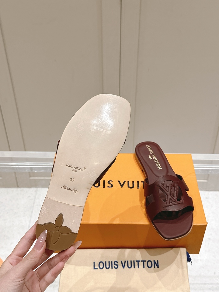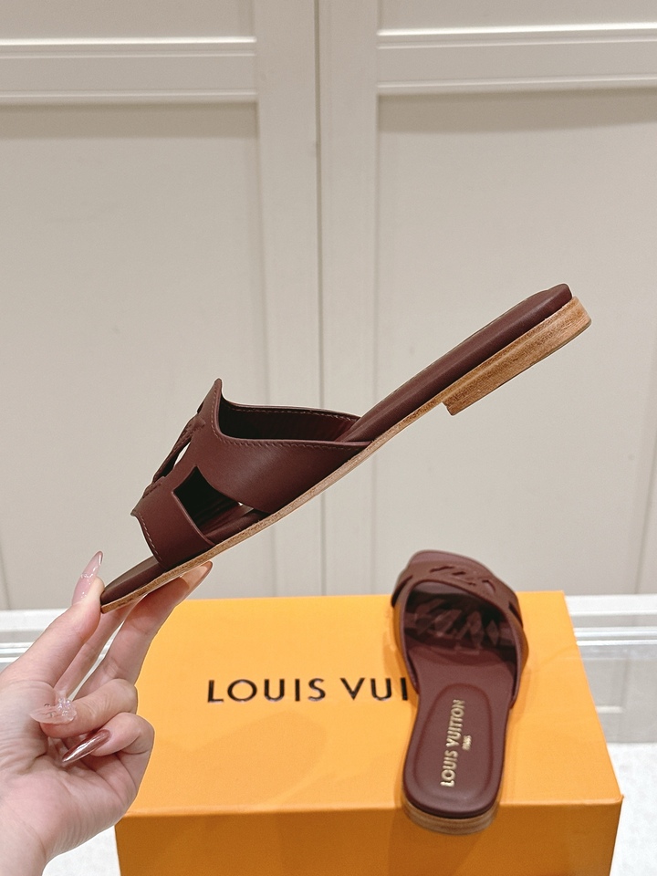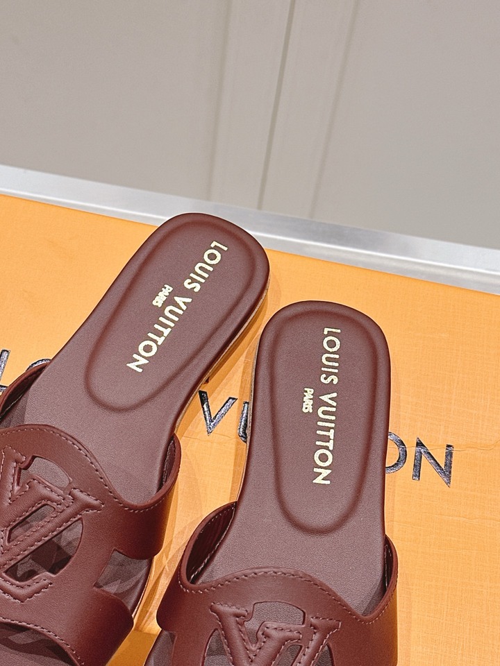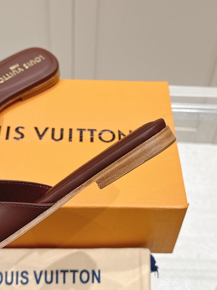 Short Description A classic flat mule made from soft calfskin, featuring a distinctive LV cutout logo and a comfortable padded insole, perfect for daily elegance. حذاء مسطح كلاسيكي مصنوع من جلد العجل الناعم، يتميز بشعار لويس فيتون المميز ونعل داخلي مريح، مثالي للأناقة اليومية.