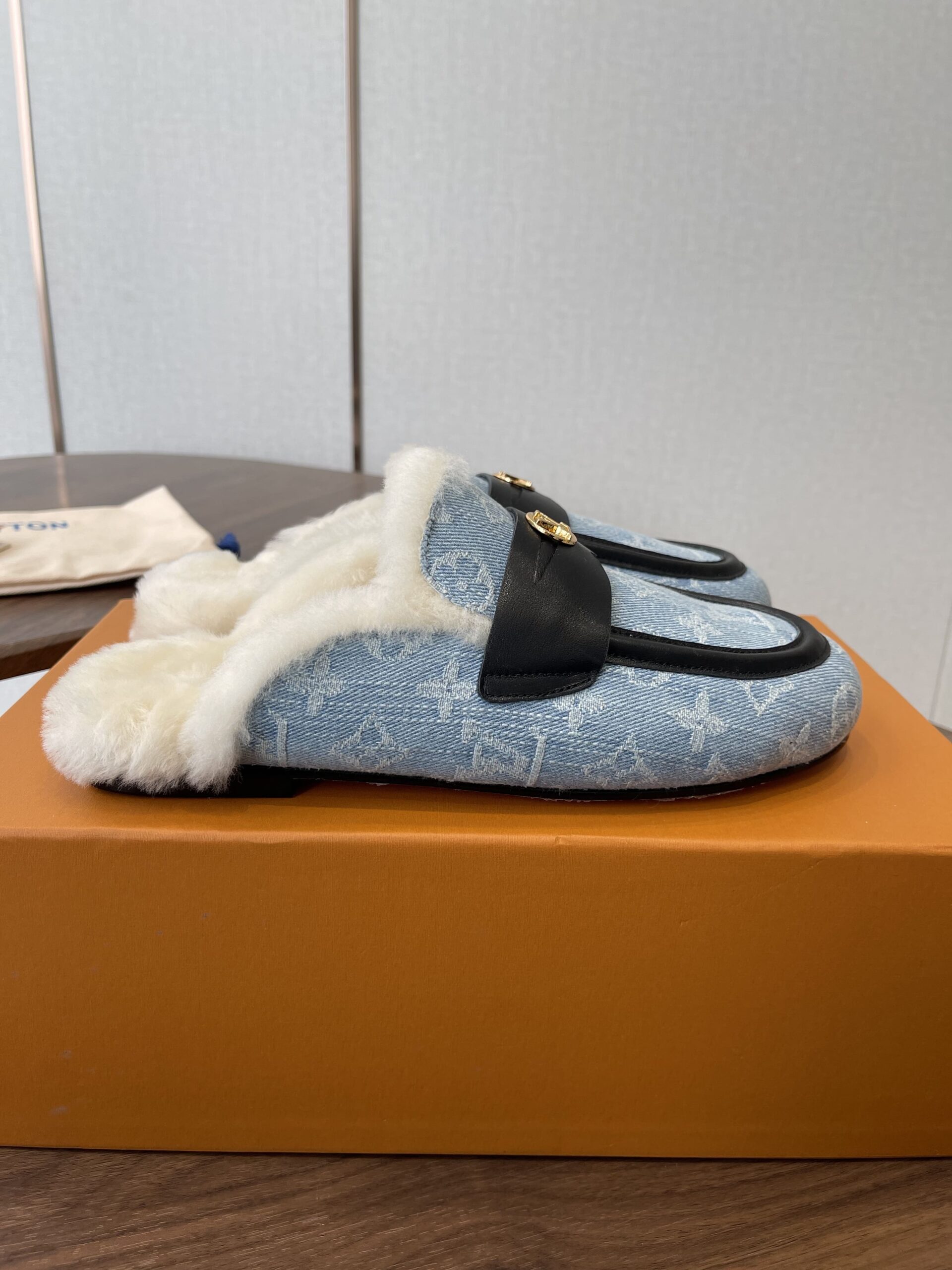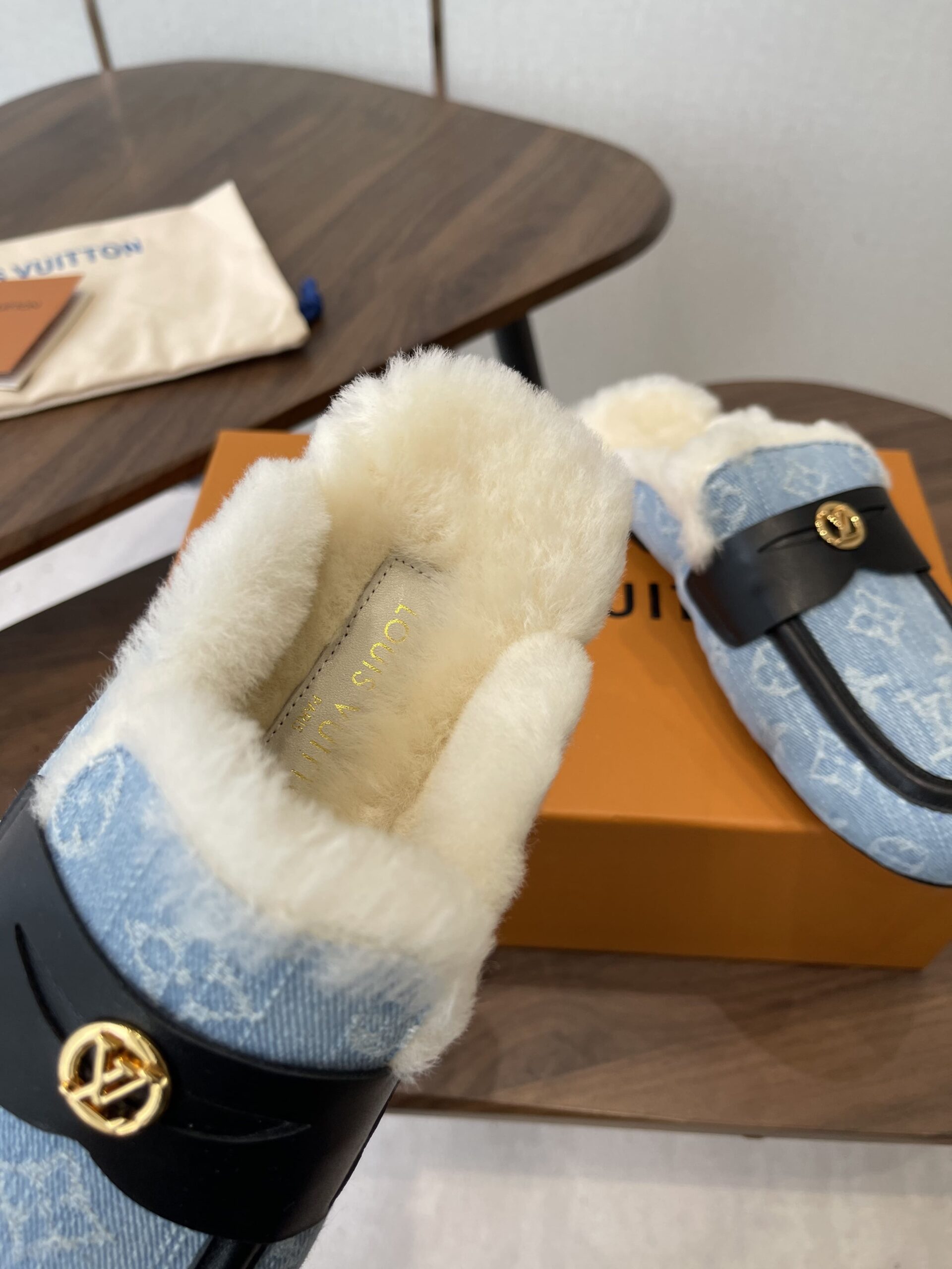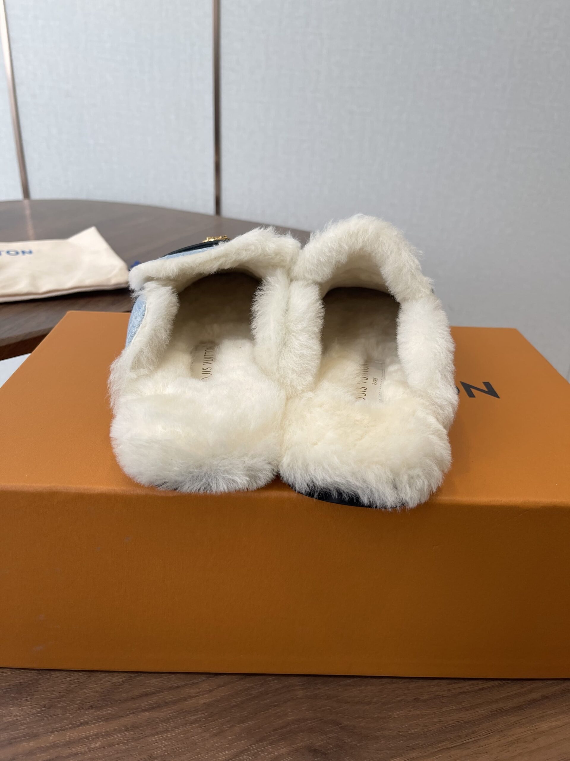 DescriptionPart of the latest collection, these mules feature a cozy fur lining and a stylish suede upper with LV details, perfect for autumn and winter comfort and style.الوصفجزء من أحدث تشكيلة، تتميز هذه الأحذية ببطانة فرو دافئة وجزء علوي أنيق من جلد الغزال مع تفاصيل LV، مثالية لراحة وأناقة الخريف والشتاء