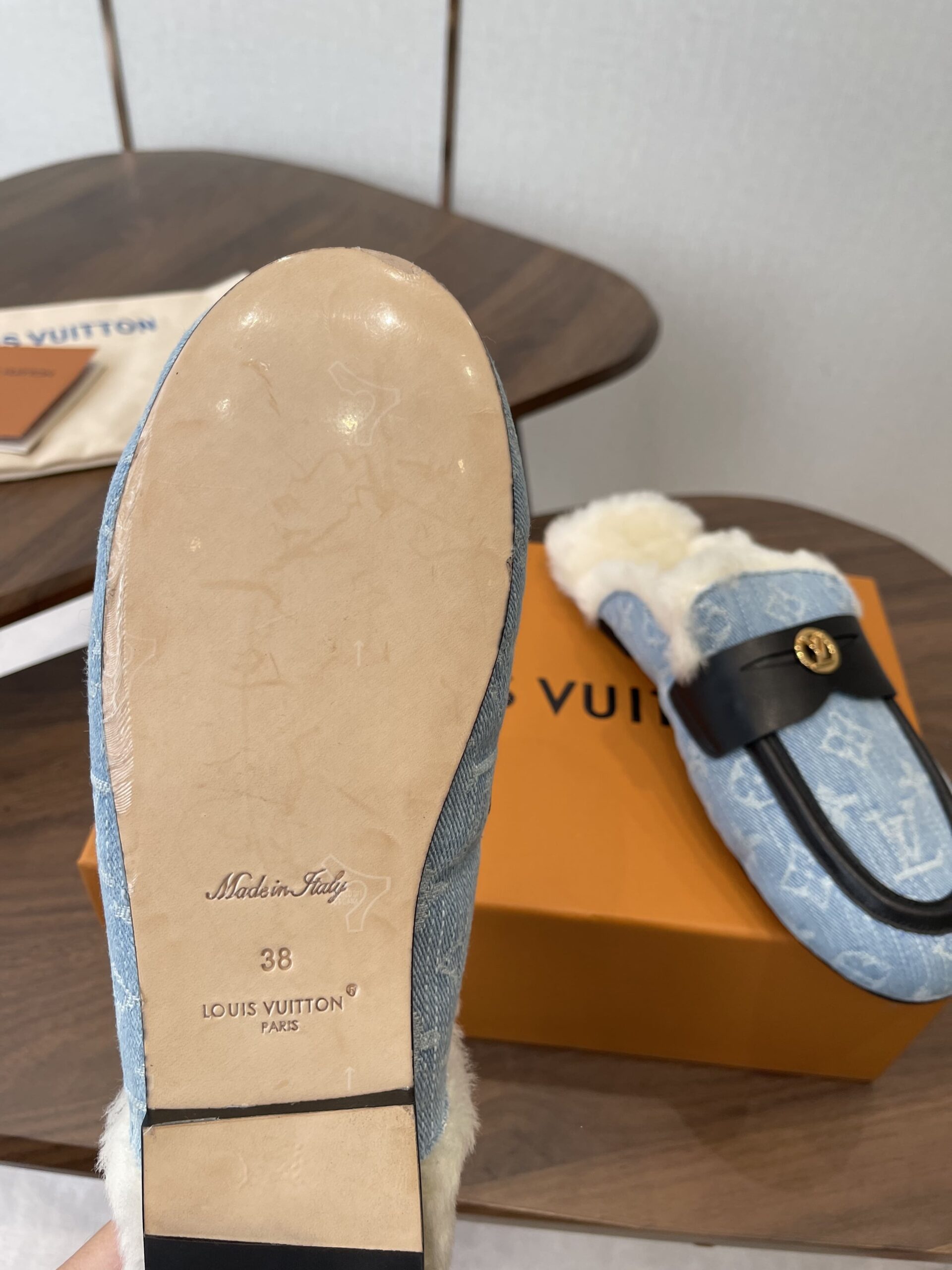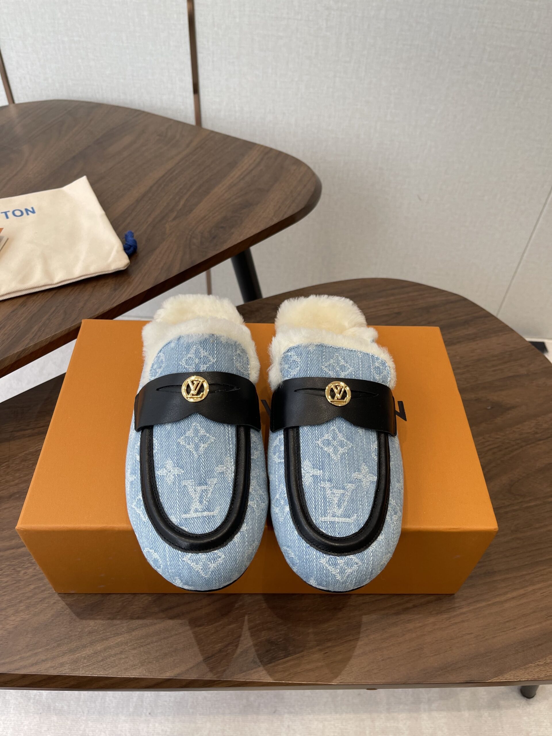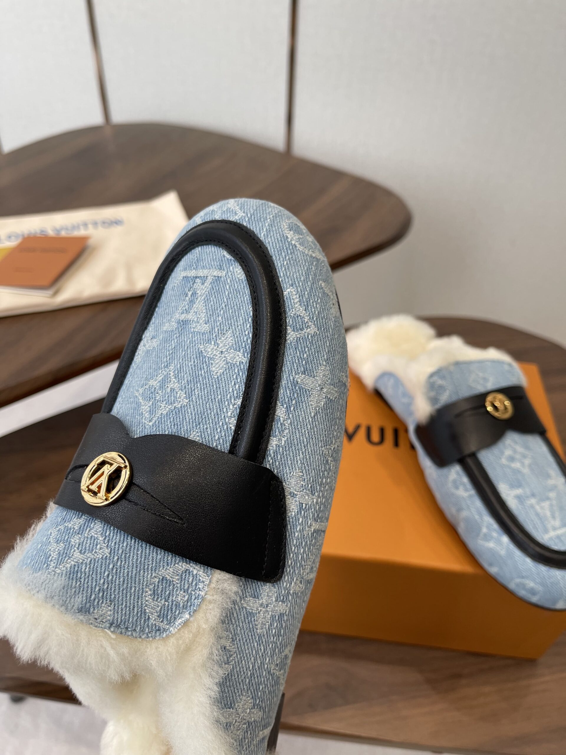 DescriptionPart of the latest collection, these mules feature a cozy fur lining and a stylish suede upper with LV details, perfect for autumn and winter comfort and style.الوصفجزء من أحدث تشكيلة، تتميز هذه الأحذية ببطانة فرو دافئة وجزء علوي أنيق من جلد الغزال مع تفاصيل LV، مثالية لراحة وأناقة الخريف والشتاء