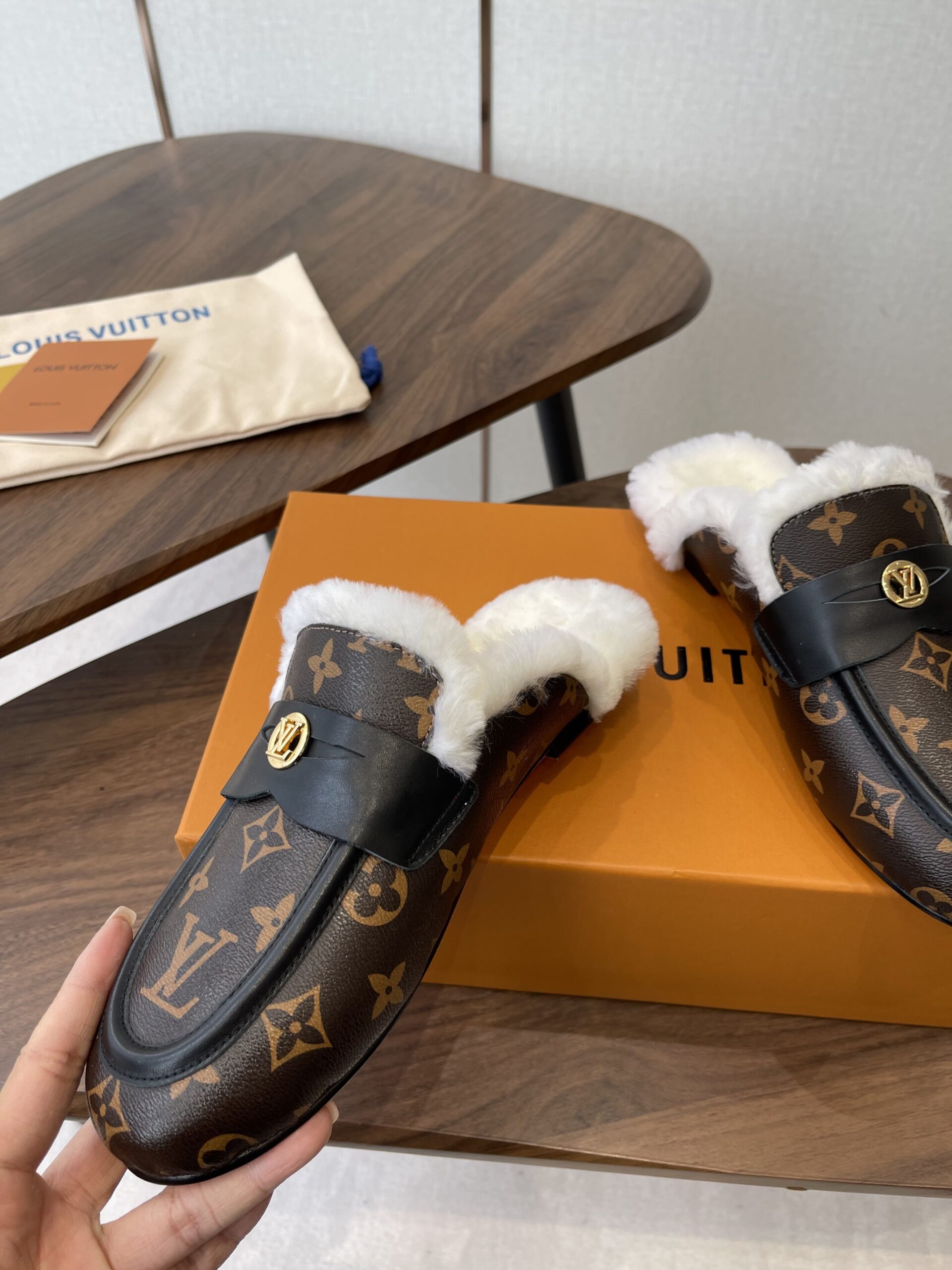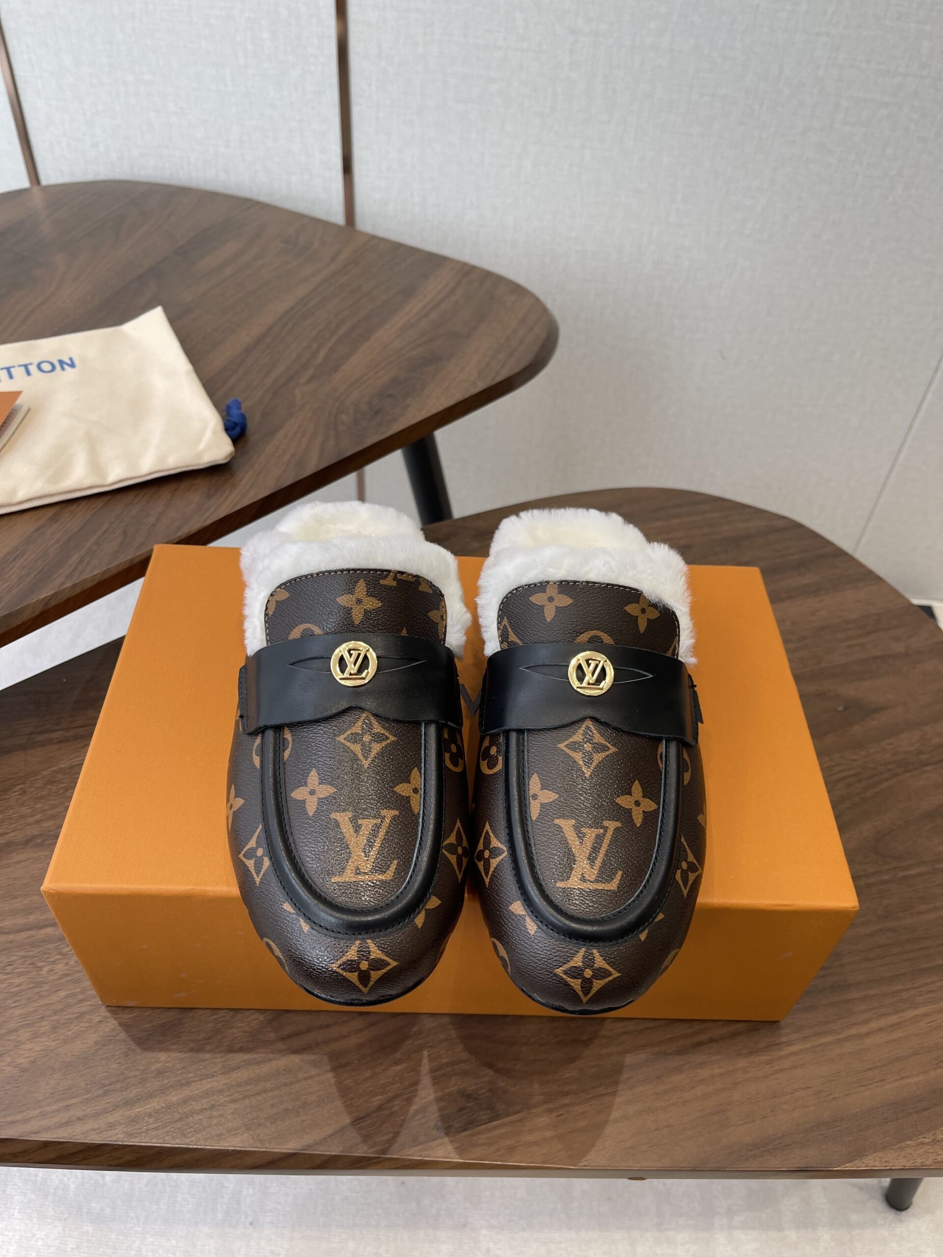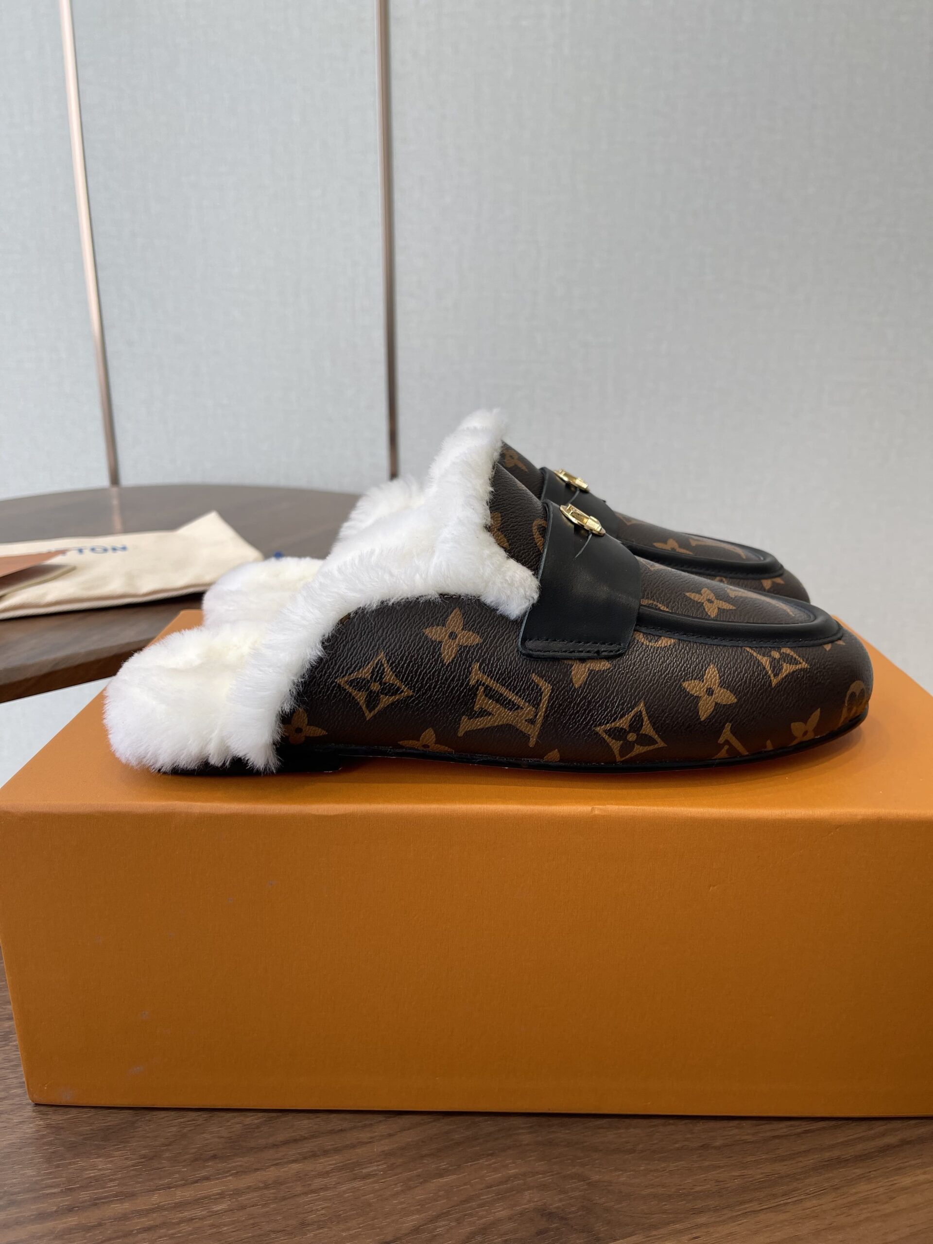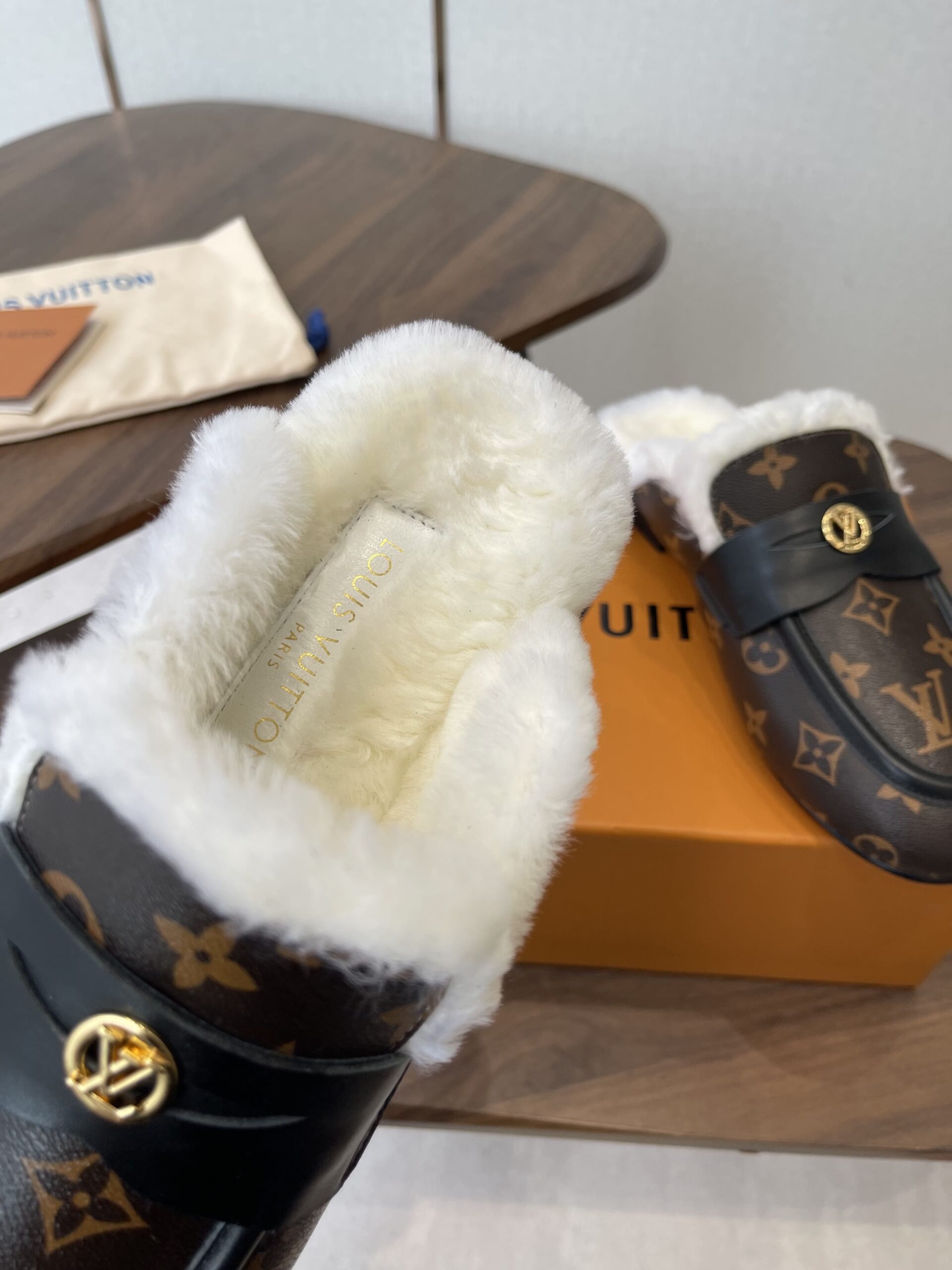 DescriptionPart of the latest collection, these mules feature a cozy fur lining and a stylish suede upper with LV details, perfect for autumn and winter comfort and style.الوصفجزء من أحدث تشكيلة، تتميز هذه الأحذية ببطانة فرو دافئة وجزء علوي أنيق من جلد الغزال مع تفاصيل LV، مثالية لراحة وأناقة الخريف والشتاء
