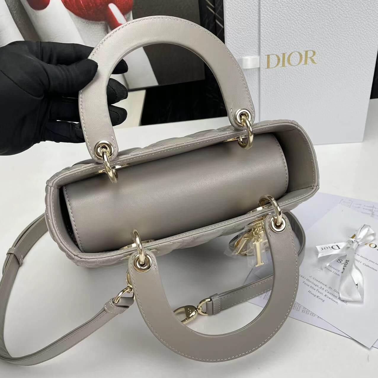 Features Top handles, D.I.O.R. charms, interior zip pocket, large slip pocket, and a thin, adjustable, and removable shoulder strap مقابض علوية، وشعارات D.I.O.R.، وجيب داخلي بسحاب، وجيب كبير منزلق، وحزام كتف رفيع قابل للتعديل والفصل