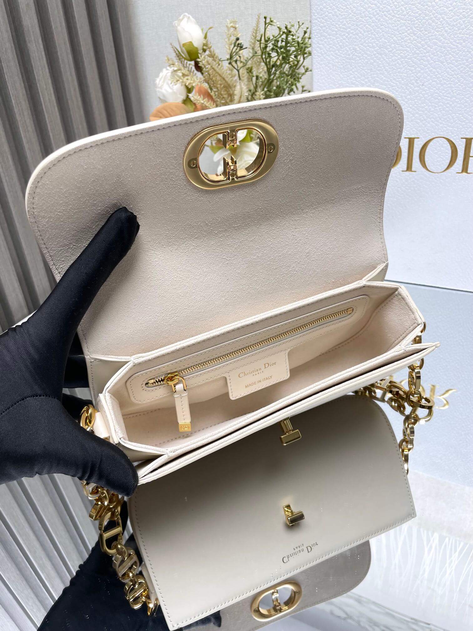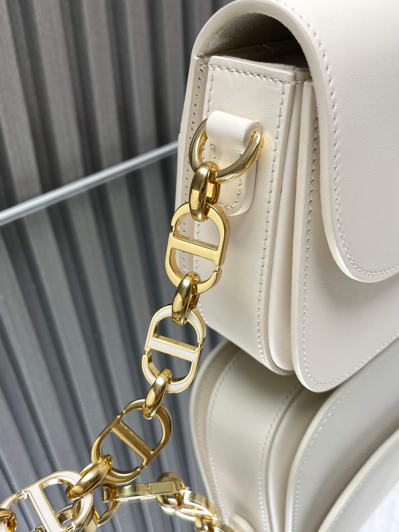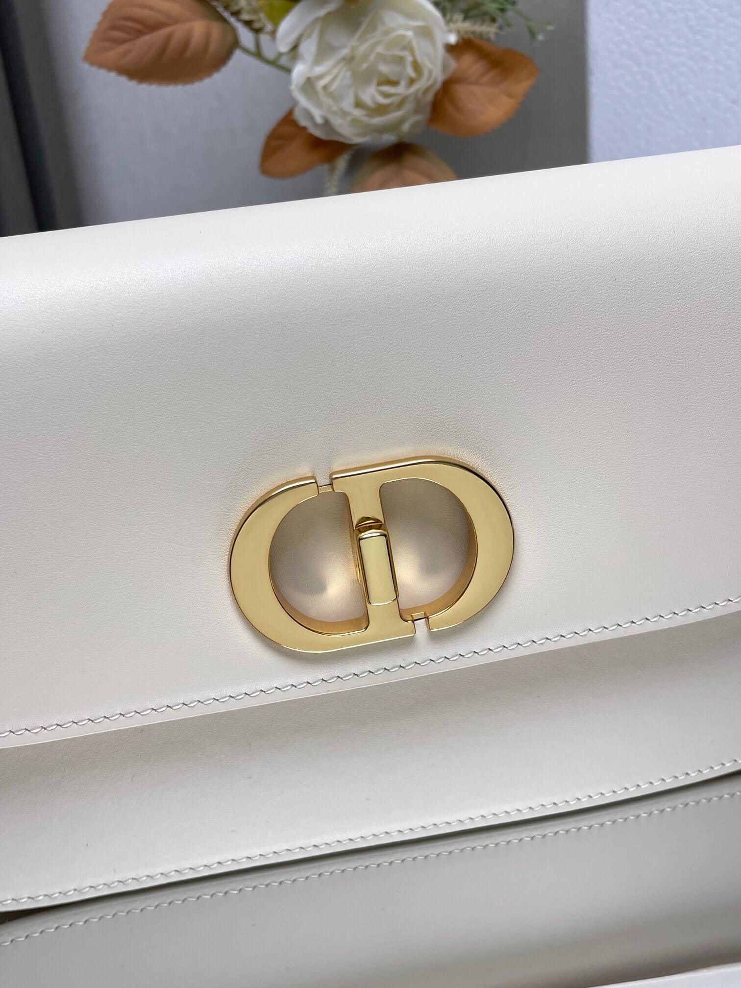 Features 3-layer internal compartment, Tonal white enamel CD link chain, Embossed 30 Montaigne logo on back, CD buckle مقسمة داخلياً لثلاث طبقات، سلسلة حلقات CD من المينا البيضاء، توقيع 30 Montaigne بارز في الخلف، إبزيم CD