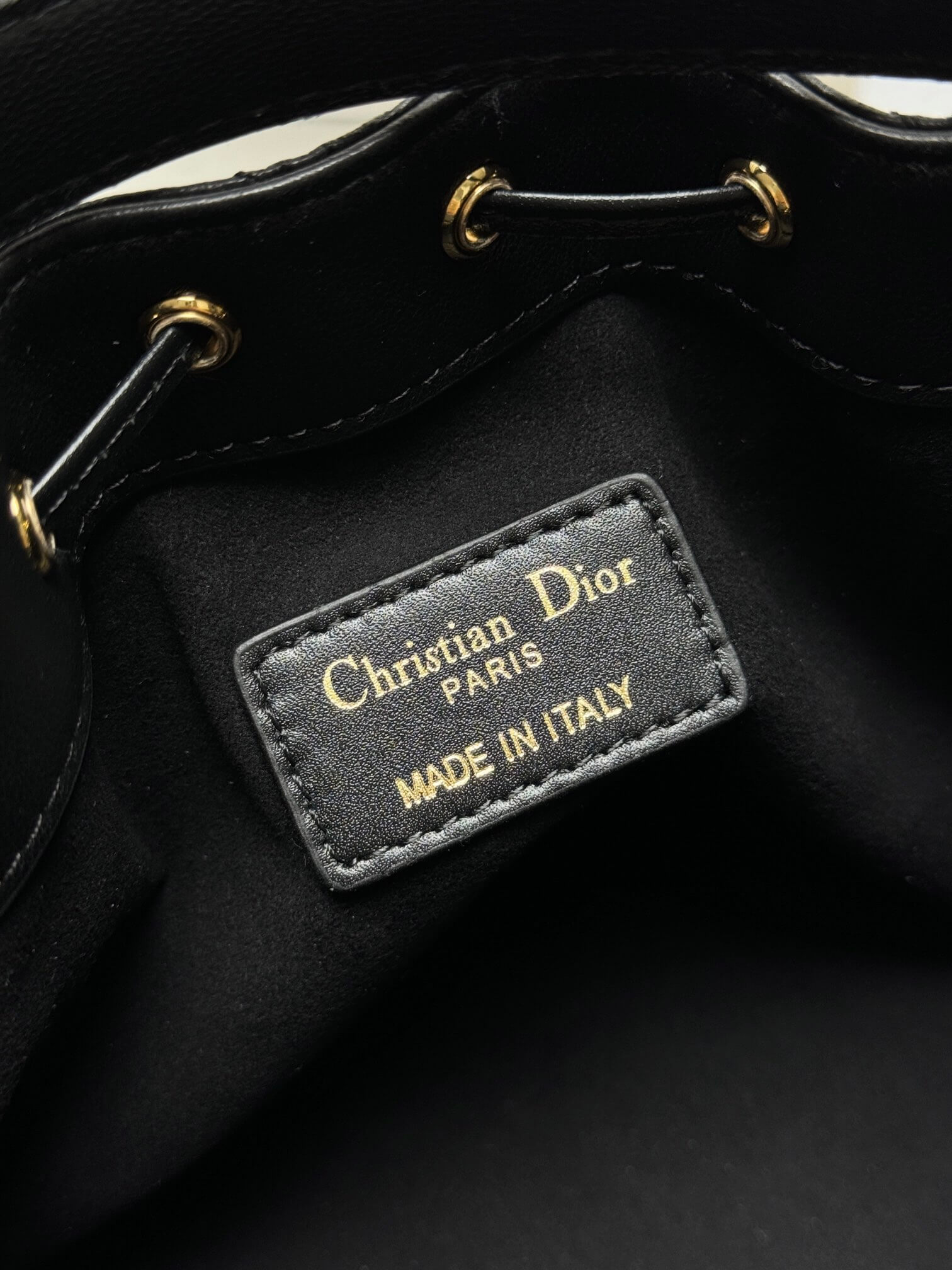 Features Drawstring closure, detachable off-white leather handle, gold-tone CD links with resin beads, adjustable/detachable chain strap إغلاق برباط، مقبض جلدي أوف-وايت قابل للفصل، حلقات CD مطلية بالذهب مع خرز ريزين، حزام سلسلة قابل للتعديل والفصل