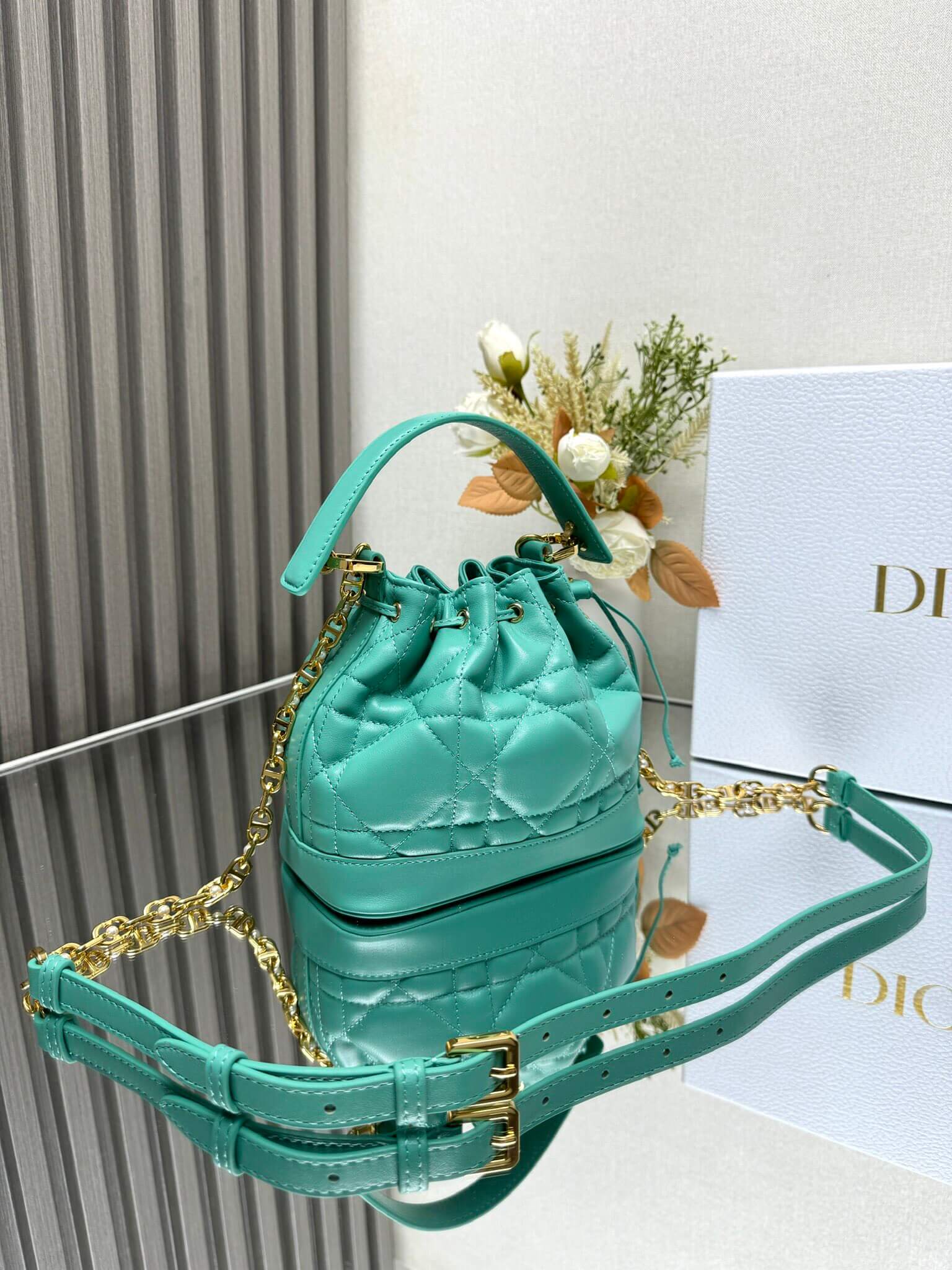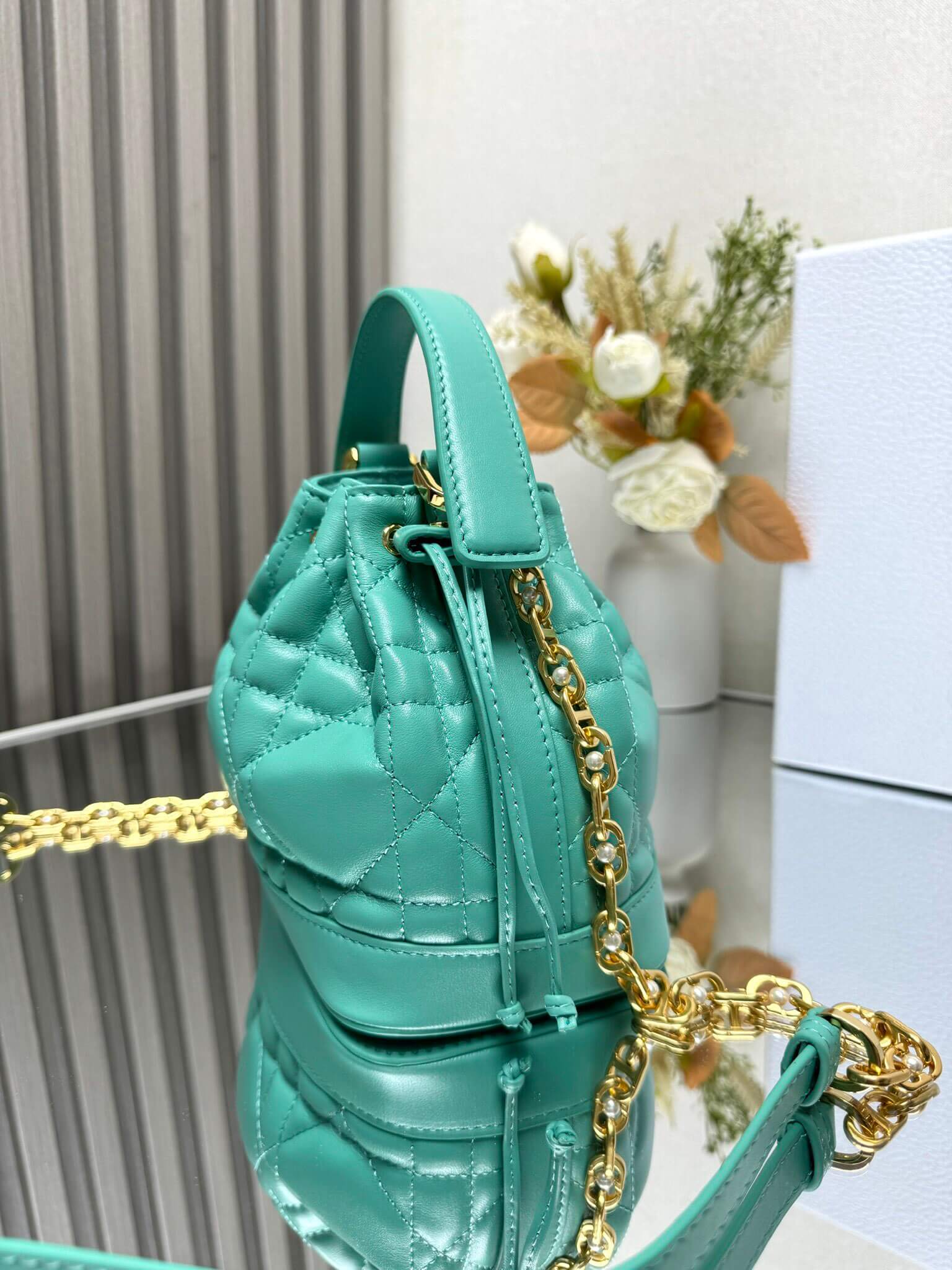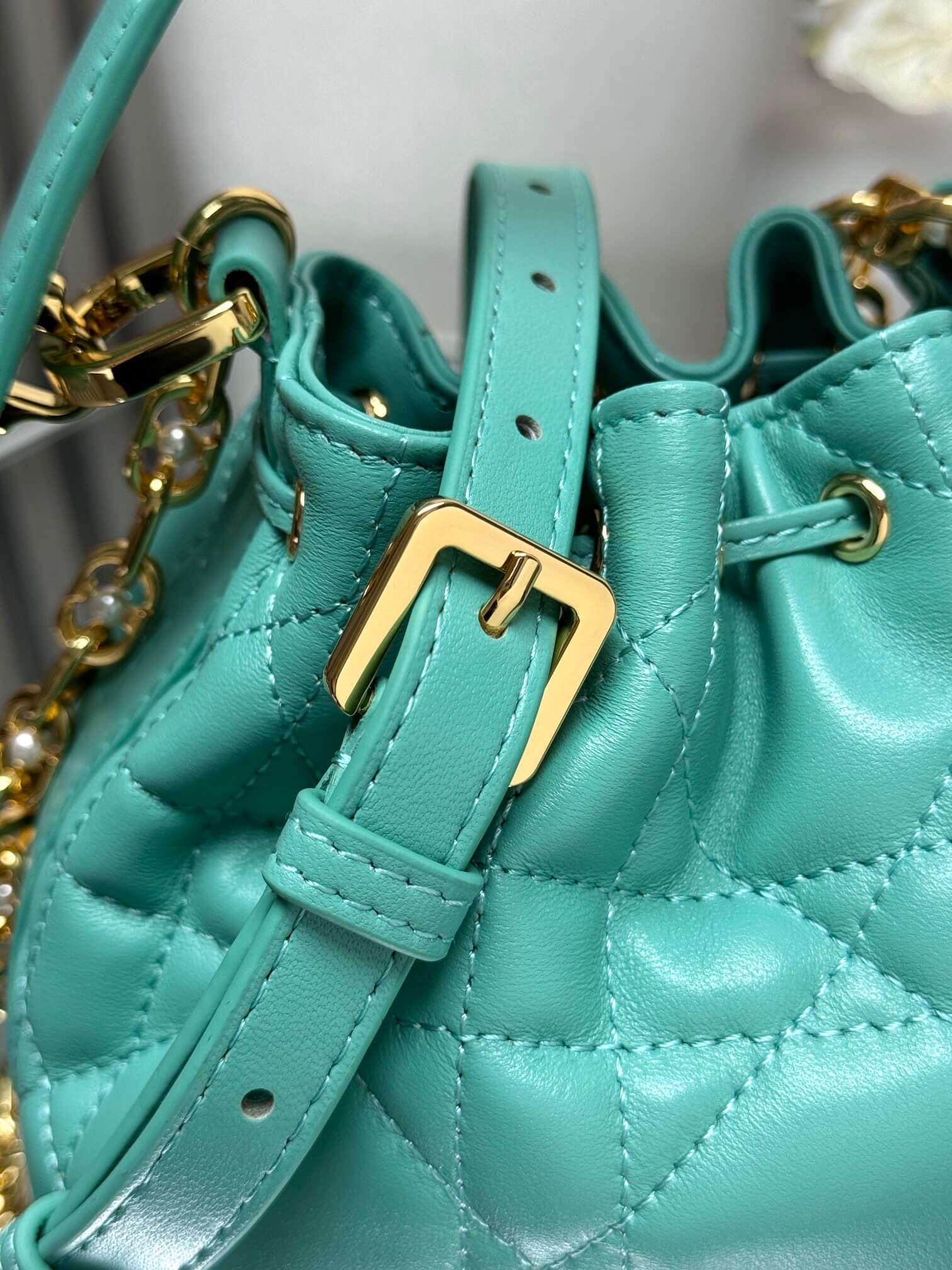 Features Drawstring closure, detachable leather handle, gold-plated CD links with resin beads, adjustable/detachable chain strap إغلاق برباط، مقبض جلدي قابل للفصل، حلقات CD مطلية بالذهب مع خرز ريزين، حزام سلسلة قابل للتعديل والفصل