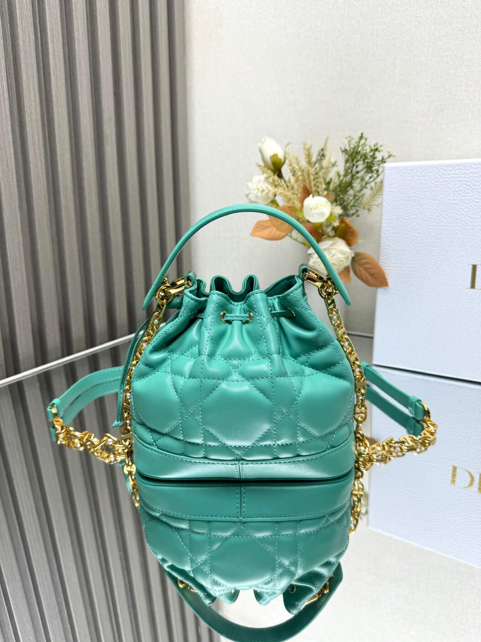 Description A sophisticated navy blue calfskin bucket bag featuring modern oversized quilting and elegant pearl-accented hardware for versatile carrying. حقيبة دلو راقية من جلد العجل الكحلي تتميز بتطريز مبطن ضخم وعصري مع إكسسوارات أنيقة مزينة باللؤلؤ لخيارات حمل متعددة.