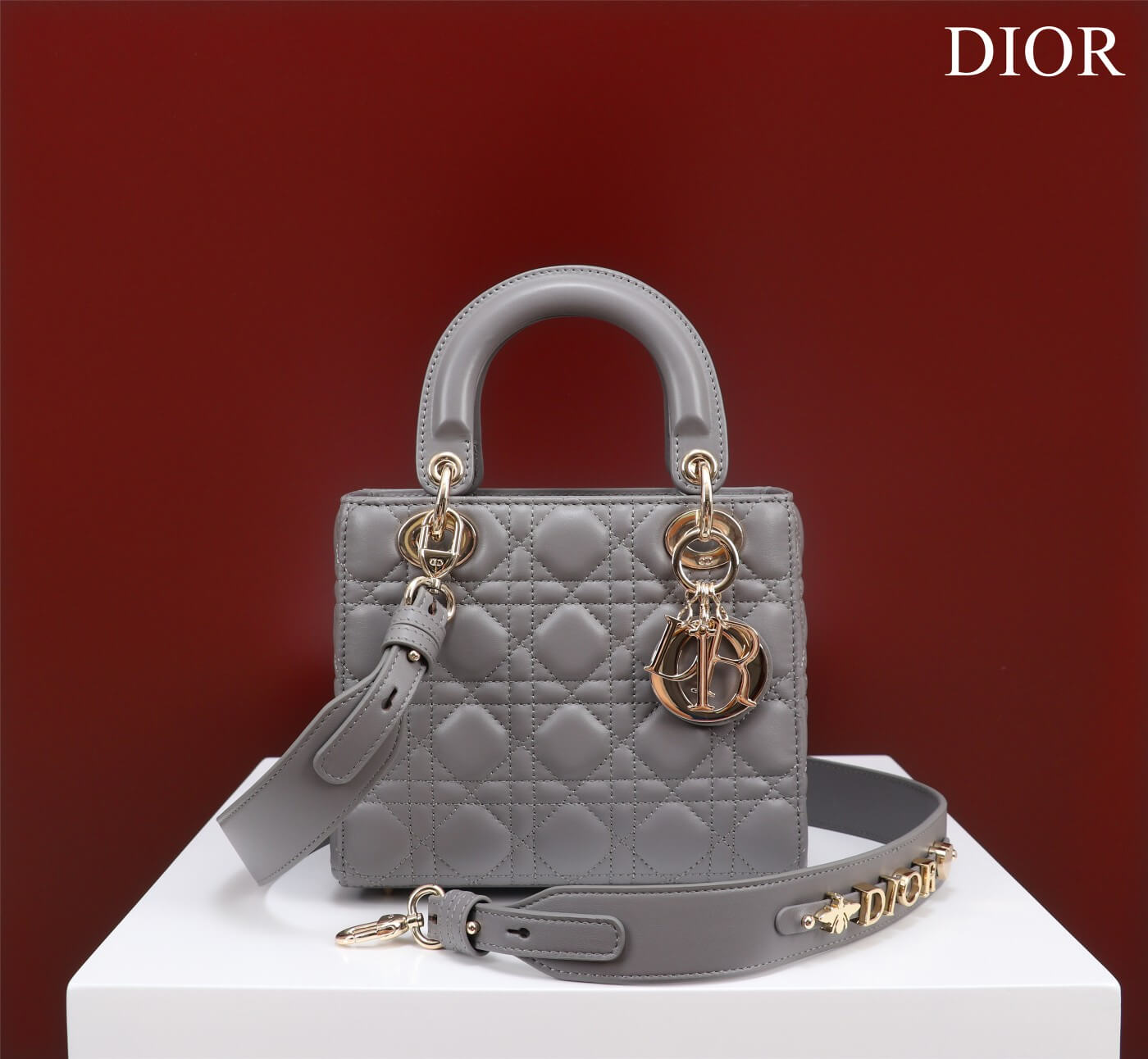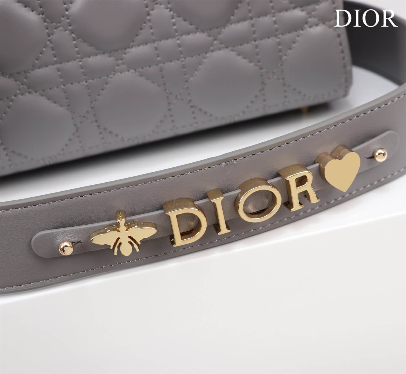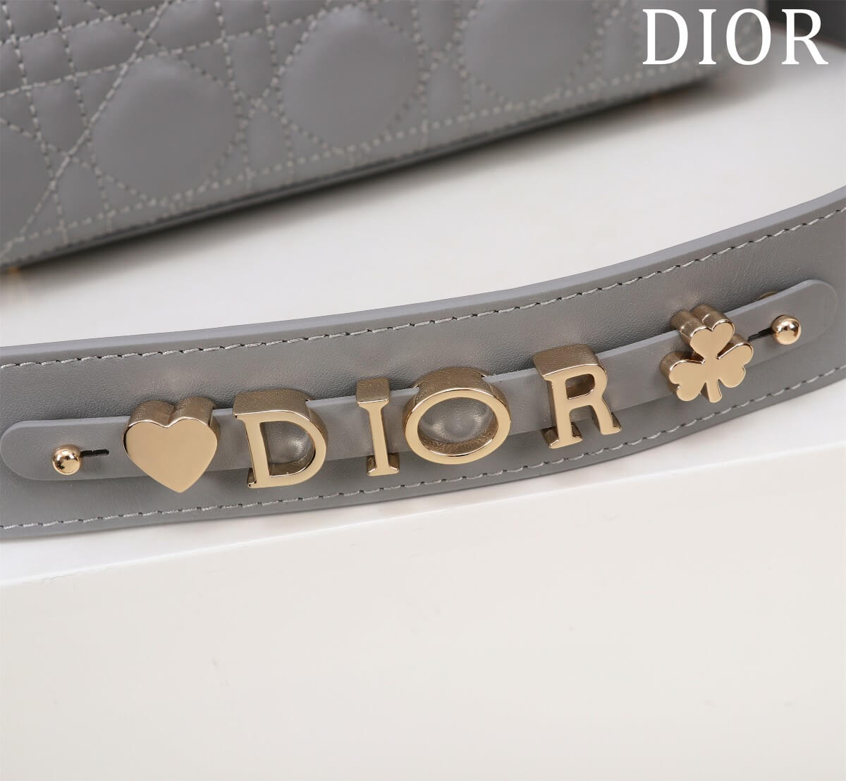 Features Gold-tone D.I.O.R. charms, Detachable leather strap (customizable with badges) حلية D.I.O.R. ذهبية، حزام جلدي قابل للفصل والتعديل (يمكن تخصيصه بشارات)