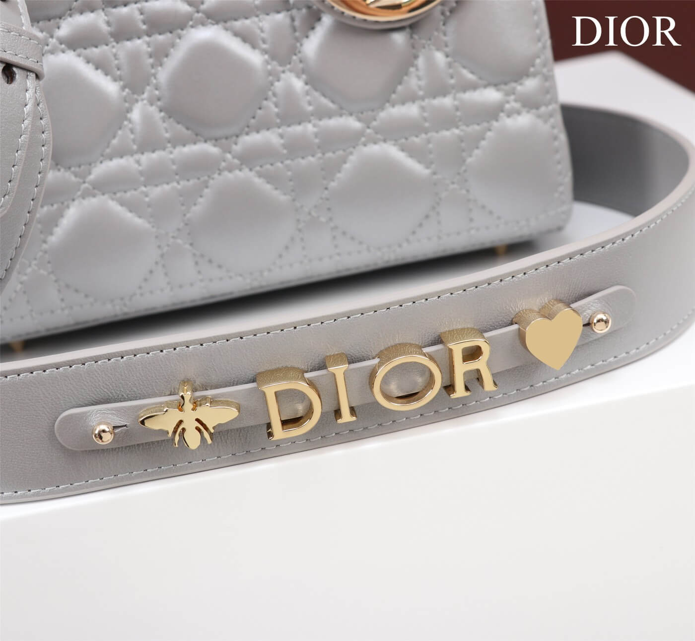 Features Gold-tone D.I.O.R. charms, Detachable leather strap (customizable with badges) حلية D.I.O.R. ذهبية، حزام جلدي قابل للفصل والتعديل (يمكن تخصيصه بشارات)